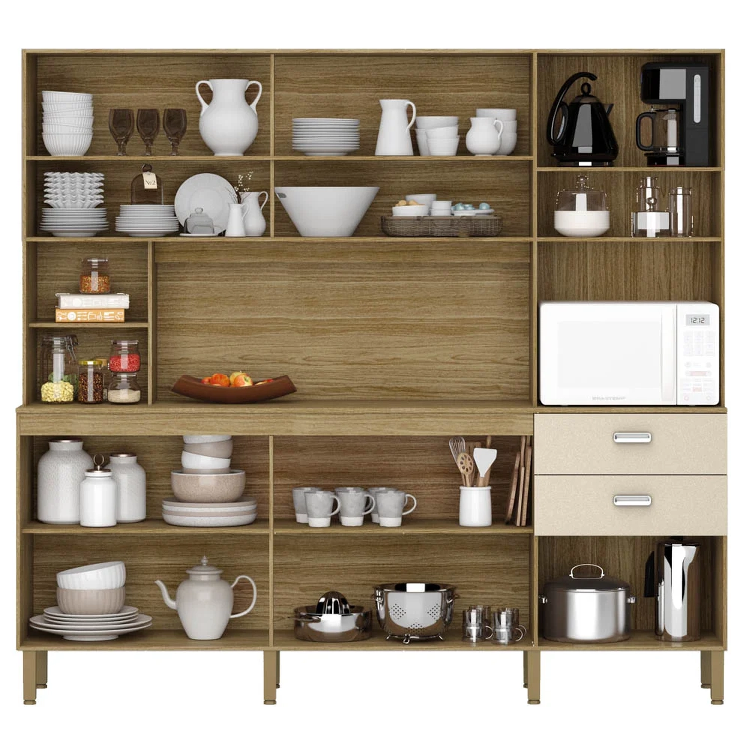 Uma Cozinha Prática, que conta com 3 nichos decorativos permitindo personalizar a decoração da cozinha e guardar itens do dia a dia, deixando o ambiente ainda mais bonito e funcional. Não podemos esquecer do nicho para forno elétrico ou micro-ondas, com um espaço amplo para garantir a praticidade na hora de cozinhar e utilizar no dia a dia. A Cozinha com Gaveta tem corrediças telescópicas são um verdadeiro show à parte, proporcionando um deslize suave e sem esforço, sem contar que são super espaçosas e garantem a organização dos utensílios da cozinha. Os pés com regulagem, os puxadores em plástico com pintura inox e as portas em 15 mm de espessura garantem resistência e durabilidade, além de um design moderno e sofisticado.