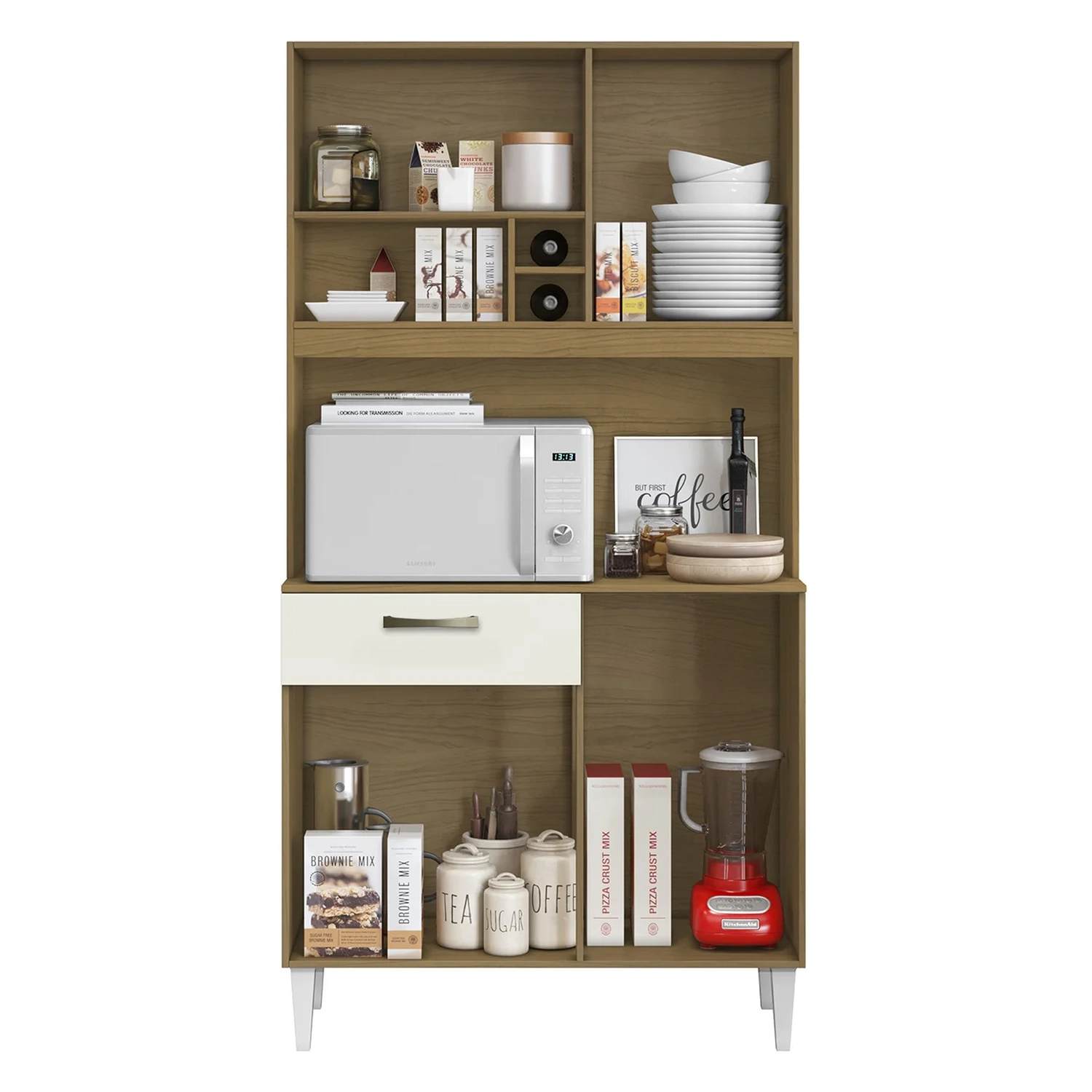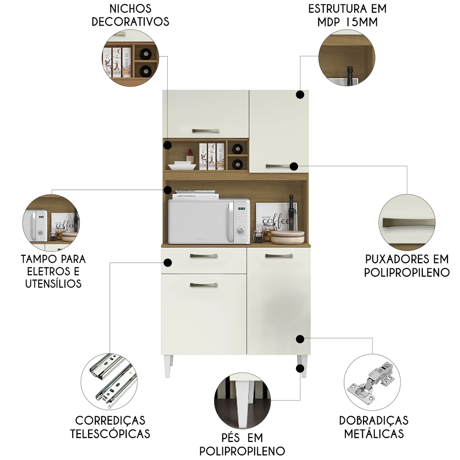 Possui três nichos práticos para acomodar seus utensilios ou itens para decorar conforme seu gosto, além de um tampo resistente que serve como apoio para seus eletros-domésticos.