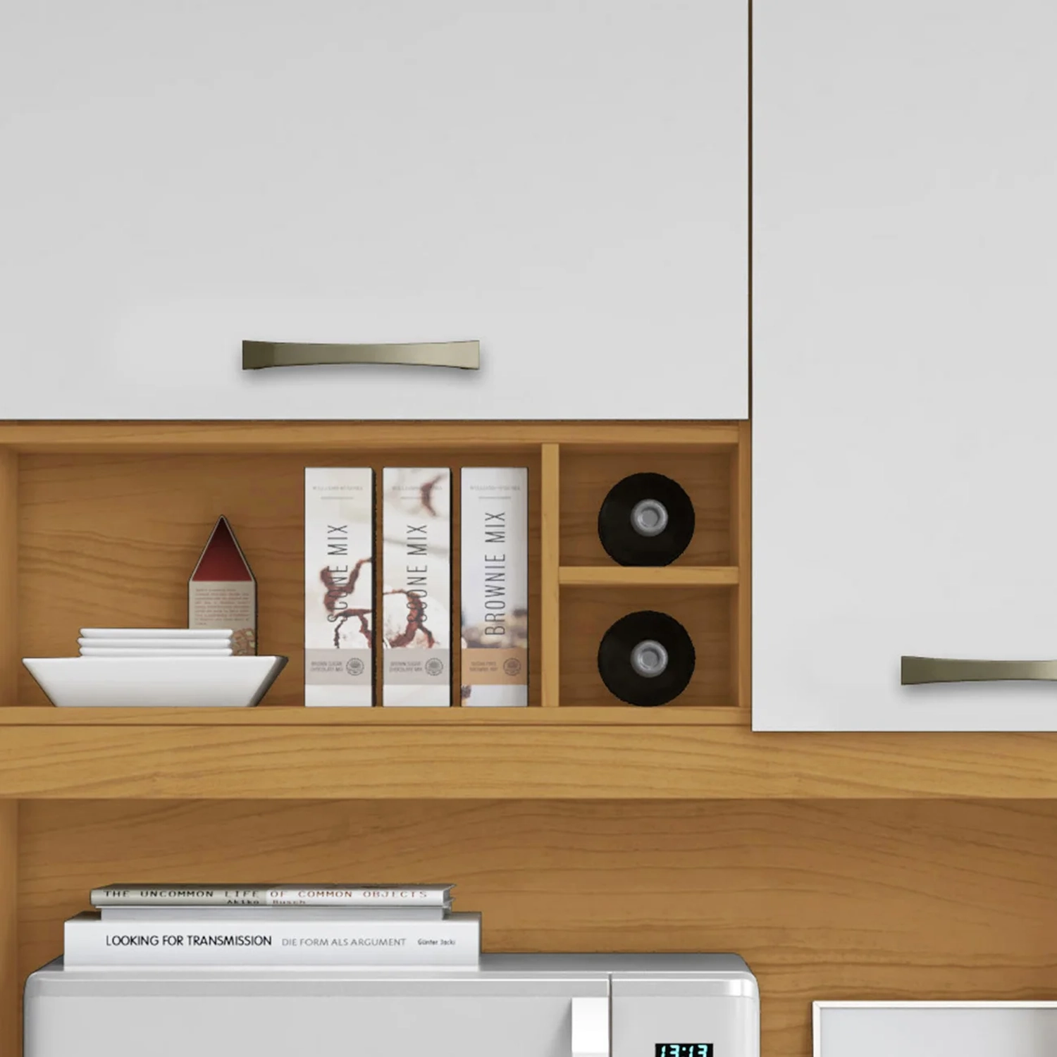 Possui três nichos práticos para acomodar seus utensilios ou itens para decorar conforme seu gosto, além de um tampo resistente que serve como apoio para seus eletros-domésticos.