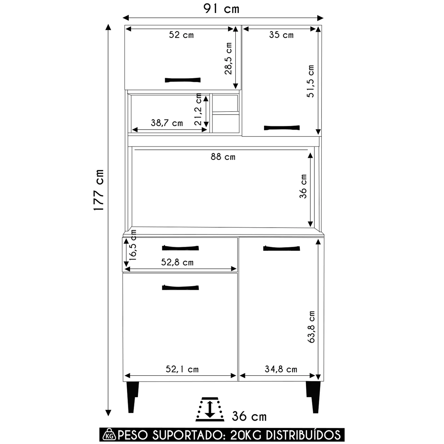 Peso Suportado: 20 Kg distribuídos.