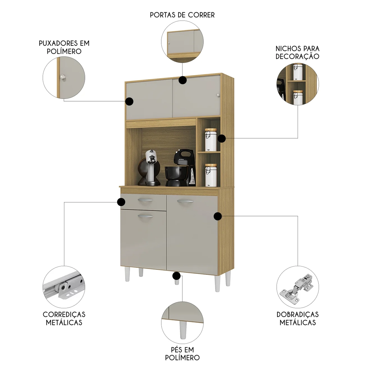 O Armário de Cozinha Compacta, e a escolha perfeita para quem busca funcionalidade e estilo. Com duas portas de abrir com dobradiças metálicas e 2 Portas de Correr, este armário oferece acesso fácil e seguro aos seus utensílios e mantimentos. A gaveta com corrediça metálica garante uma abertura suave, enquanto os dois nichos são ideais para expor suas peças favoritas ou armazenar itens de uso diário. Os detalhes fazem toda a diferença, os puxadores na porta de abrir em prata fosco e na porta de correr em cromado adicionam um toque de elegância e modernidade ao seu ambiente, os pés de plástico branco asseguram estabilidade e resistência, complementando o design sofisticado dessa cozinha compacta. Construído com MDP de alta qualidade e um acabamento em pintura UV, este armário não só otimiza o espaço da sua cozinha, mas também garante durabilidade e uma aparência impecável por muito mais tempo. Transforme sua Cozinha Funcional com este armário que une beleza e praticidade.