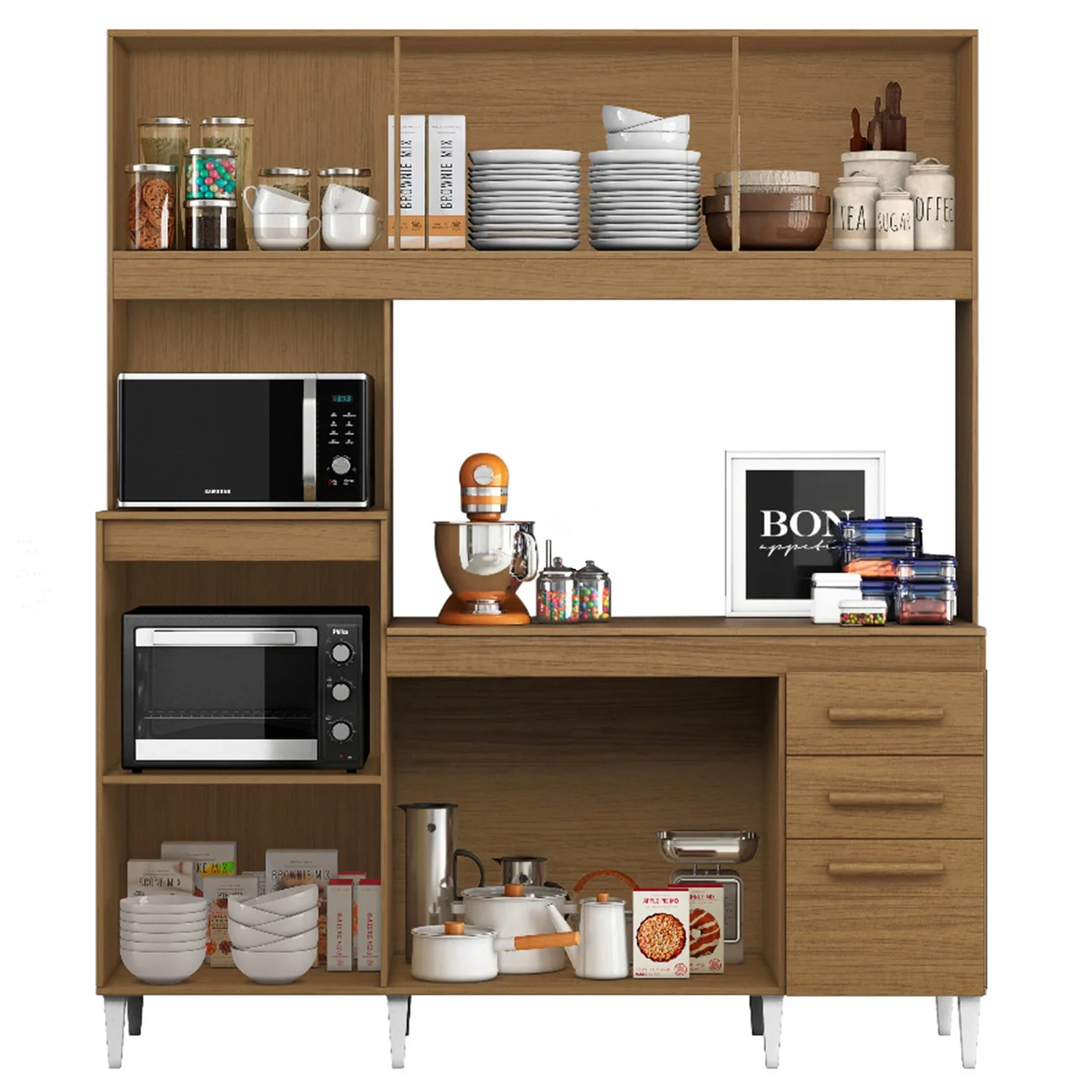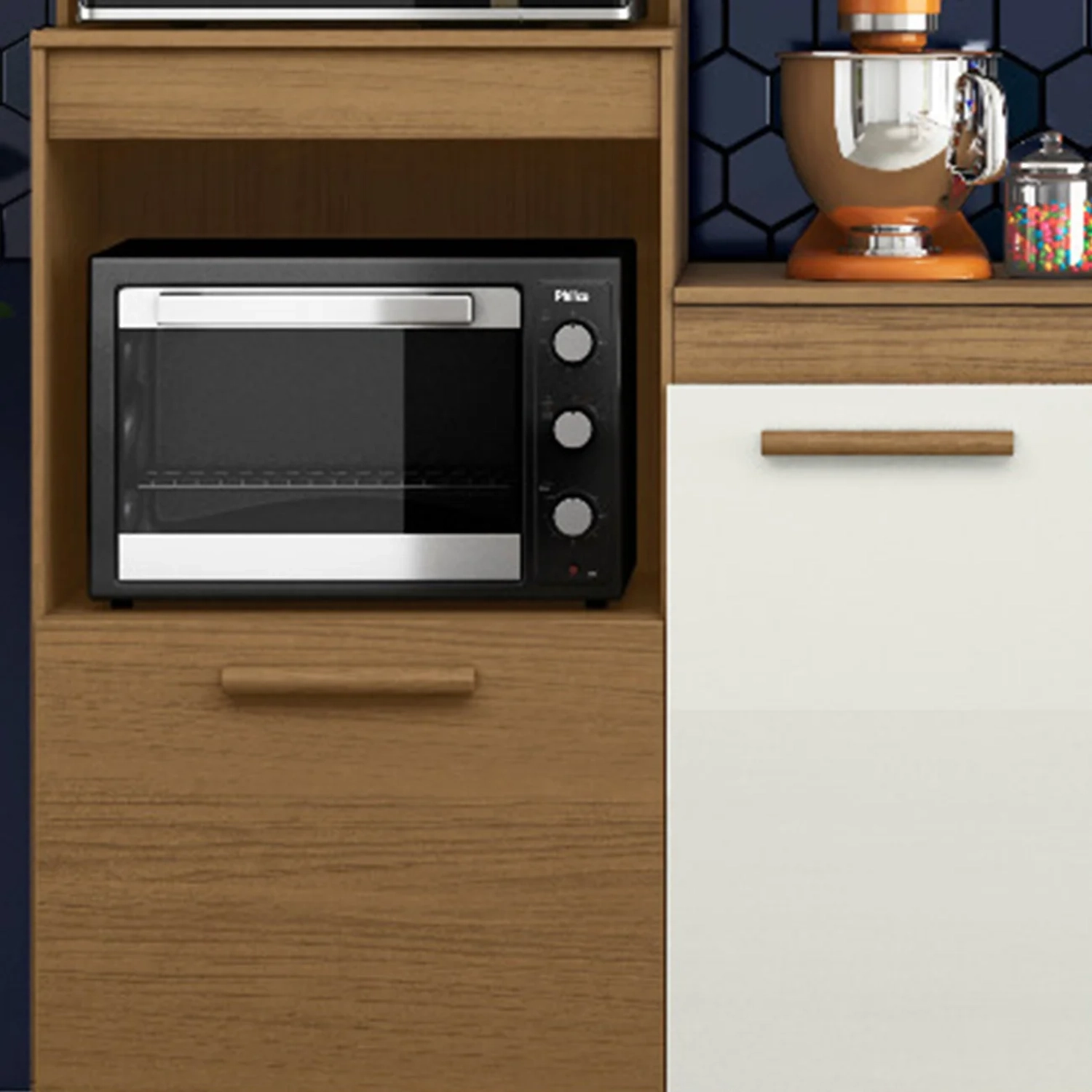 O Armário Para Cozinha tem um nicho perfeito para micro-ondas e forno elétrico, deixando tudo juntinho e organizado, ainda conta com uma superfície prática para melhor acesso.