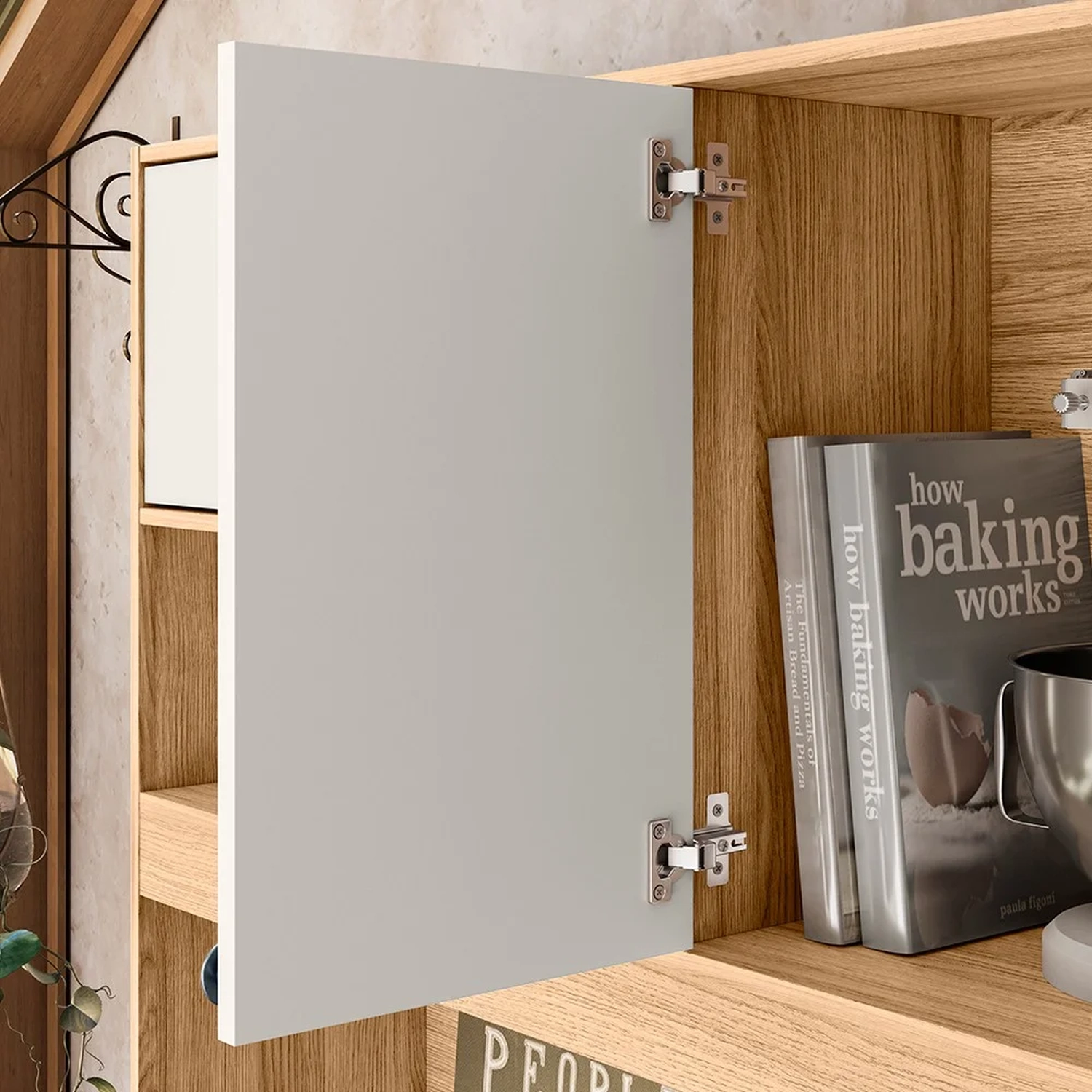 O Armário 6 Portas é equipado com dobradiças metálicas resistentes, garantindo uma abertura suave e duradoura. No interior, uma prateleira permite a organização eficiente dos itens de cozinha. A gaveta, com corrediças metálicas, assegura um deslizar fácil e seguro, ideal para guardar talheres e utensílios variados. Os três nichos são inteligentemente distribuídos, com um nicho grande o suficiente para acomodar eletrodomésticos e utensílios maiores, enquanto os dois nichos menores são perfeitos para condimentos e itens decorativos. Os puxadores em poliestireno adicionam um toque contemporâneo ao design, enquanto a estrutura em MDP de 12mm oferece estabilidade e robustez. O acabamento em pintura UV não só protege o armário, mas também dá um brilho especial, realçando a beleza do conjunto e garantindo que este armário seja um destaque para uma Cozinha Compacta por um longo tempo.