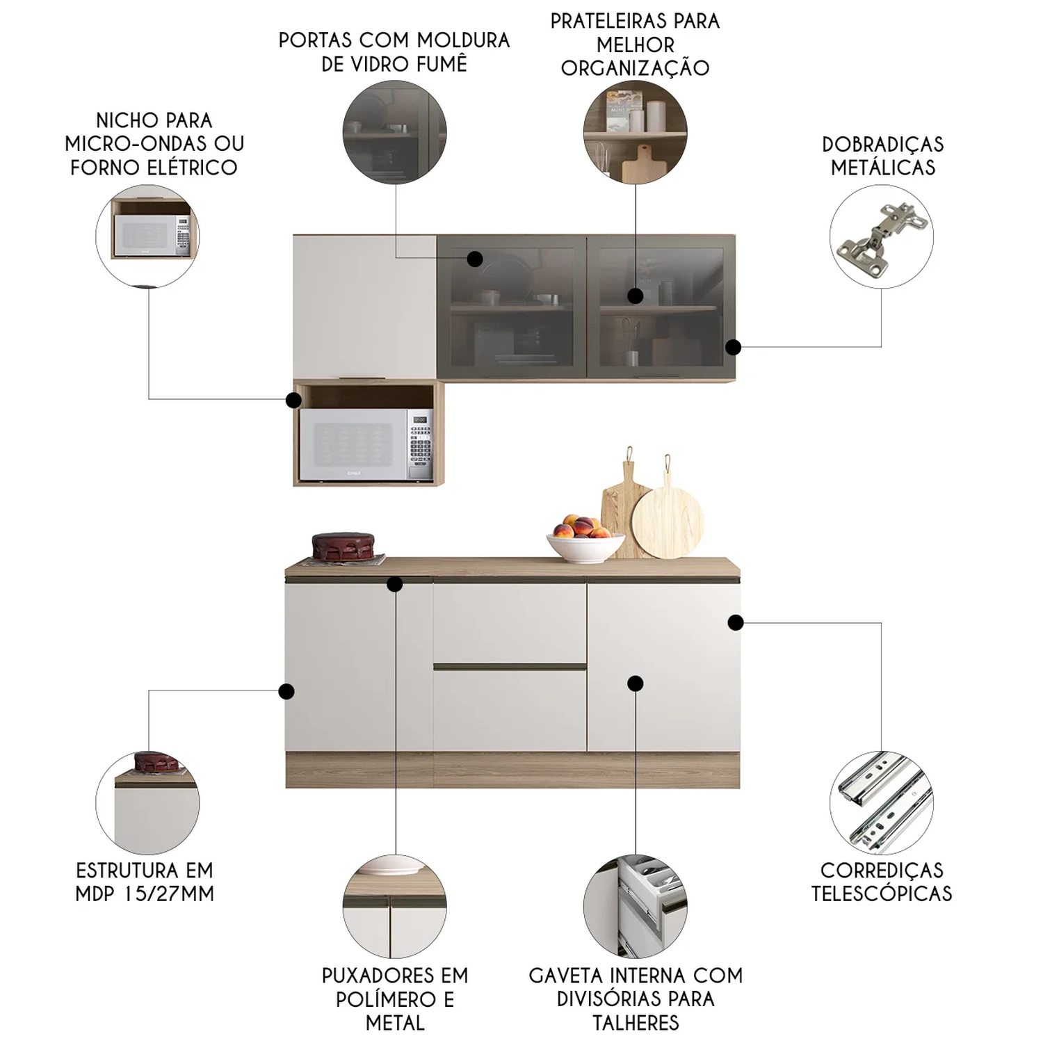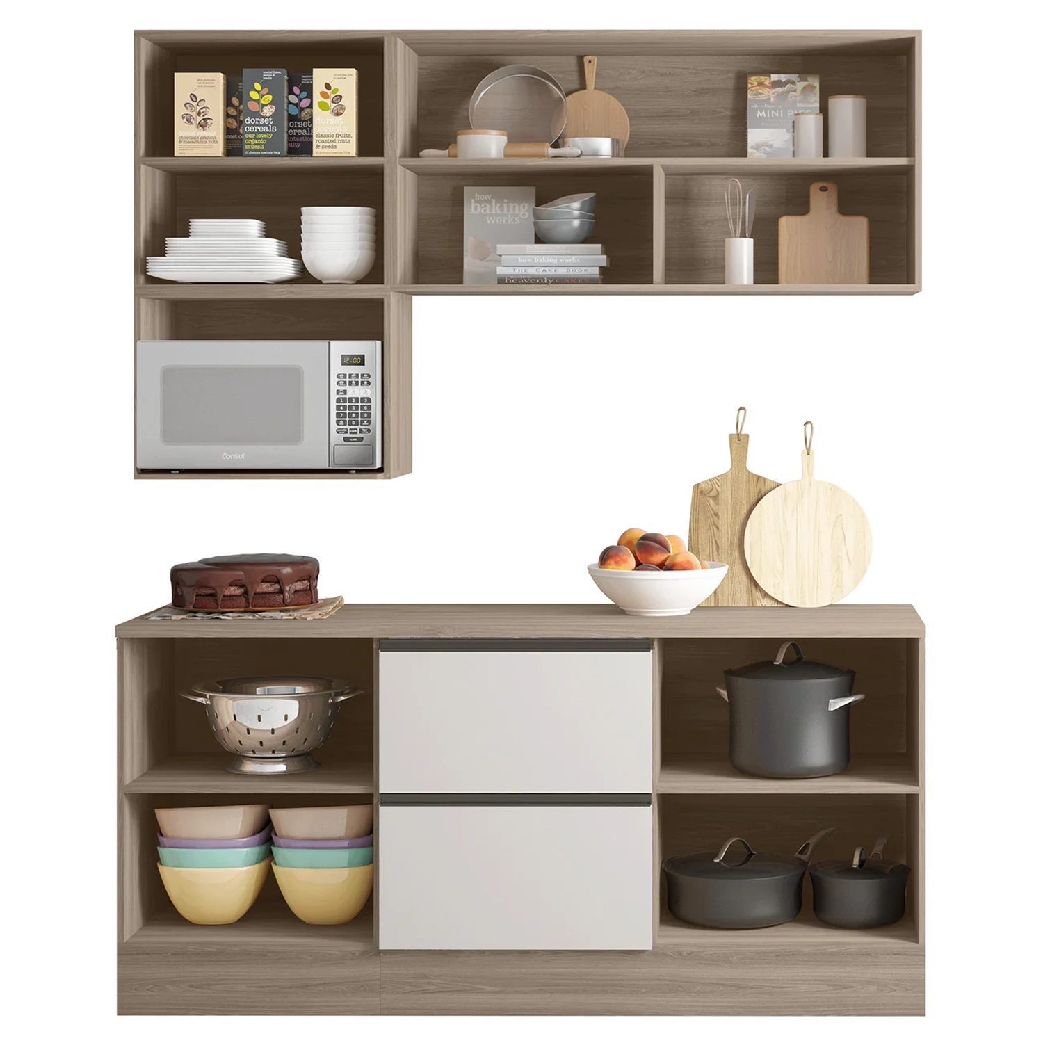 Com ótimo espaço interno, o conjunto dispõe de duas prateleiras que ajudam a organizar utensílios e mantimentos de forma eficiente. As dobradiças metálicas e corrediças telescópicas proporcionam abertura suave e durabilidade no uso contínuo.