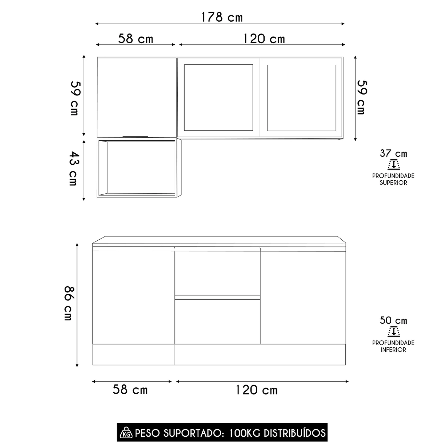 Conteúdo da Embalagem: 1 Armário Aéreo 120cm, 1 Armário Aéreo 58cm, 1 Nicho, 1 Balcão 120cm, 1 Balcão 58cm, 1 Tampo.