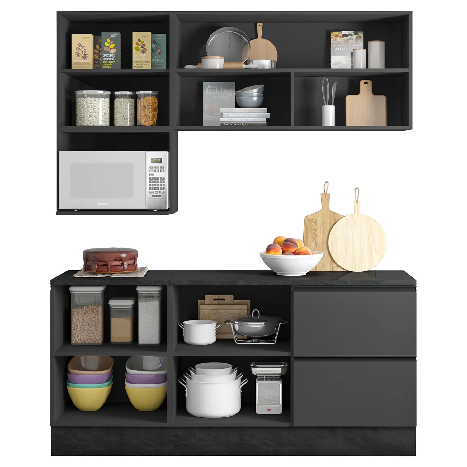 Conteúdo da Embalagem: 1 Armário Aéreo 120cm, 1 Armário Aéreo 58cm, 1 Nicho, 1 Balcão 120cm, 1 Balcão 58cm, 1 Tampo.