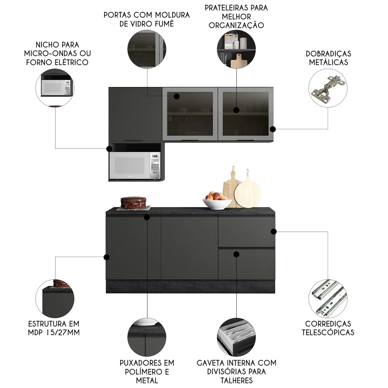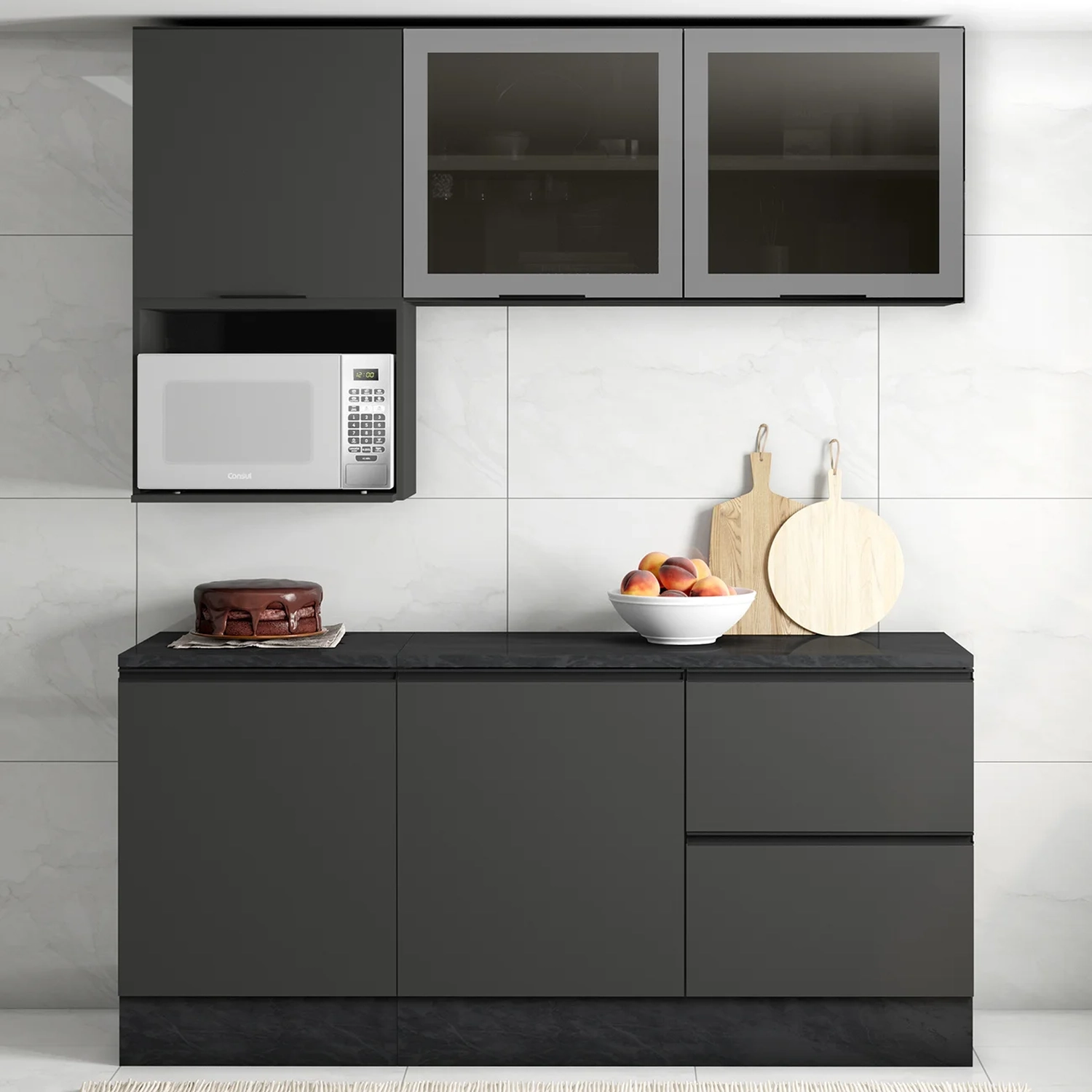 Os Armários Aéreos vem com três portas, sendo duas com moldura e vidro fumê, que agregam um toque de sofisticação. Inclui também um nicho ideal para acomodar micro-ondas ou forno elétrico, otimizando o espaço disponível.