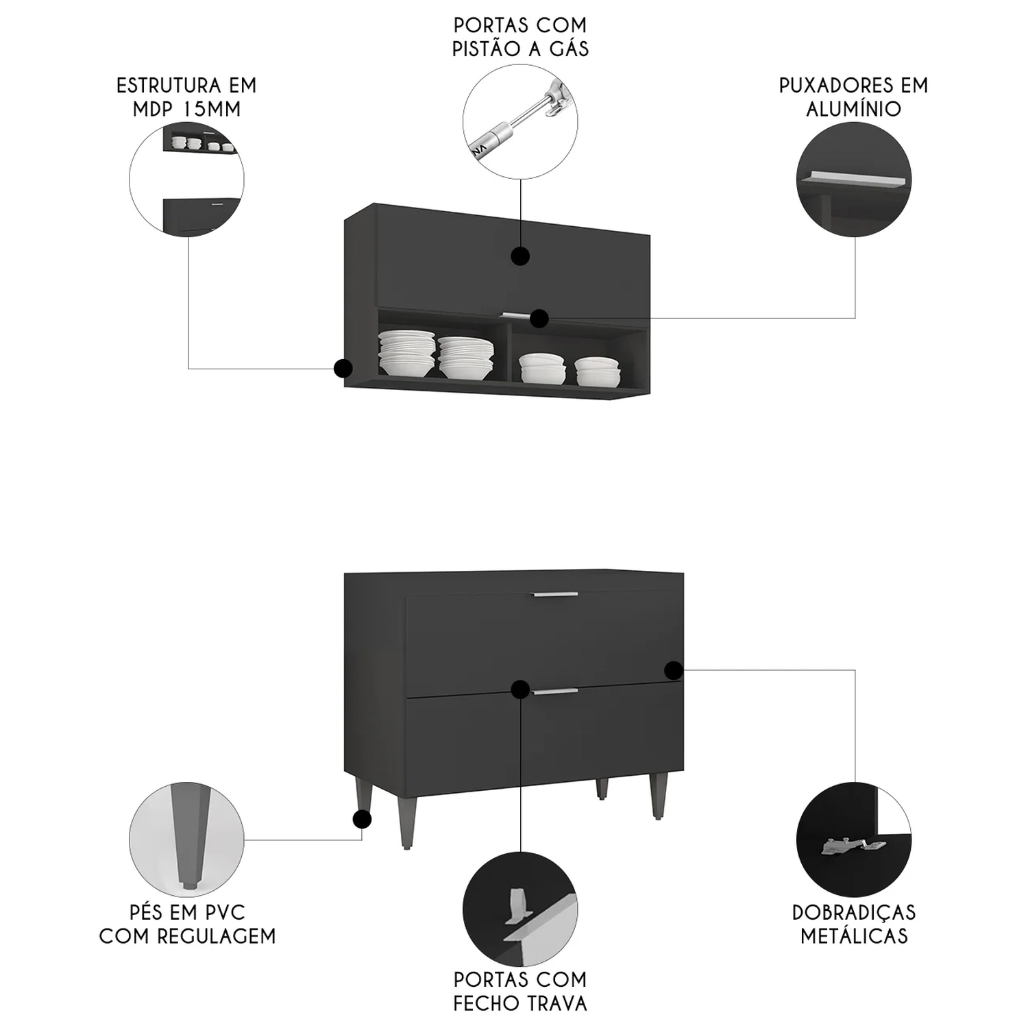 O Armário Aéreo conta com uma porta basculante com pistão a gás e dois nichos, para auxiliar na organização dos seus utensílios de forma prática e eficiente. Enquanto o Balcão Para Pia dispõe de duas portas basculantes com fecho trava de segurança, que permite o fechamento com um simples toque. Ambos possuem estrutura em MDP 15mm, com acabamento em BP, puxadores em alumínio e dobradiças metálicas, que garantem máxima resistência no uso diário. Os pés em PVC, são reguláveis, permitindo ajustar pequenos desníveis de piso. O balcão não acompanha tampo para que o uso fique opcional com tampo ou pia. Este Armário de Cozinha é a solução ideal para otimizar sua casa, combinando materiais de alta qualidade com um design sofisticado.