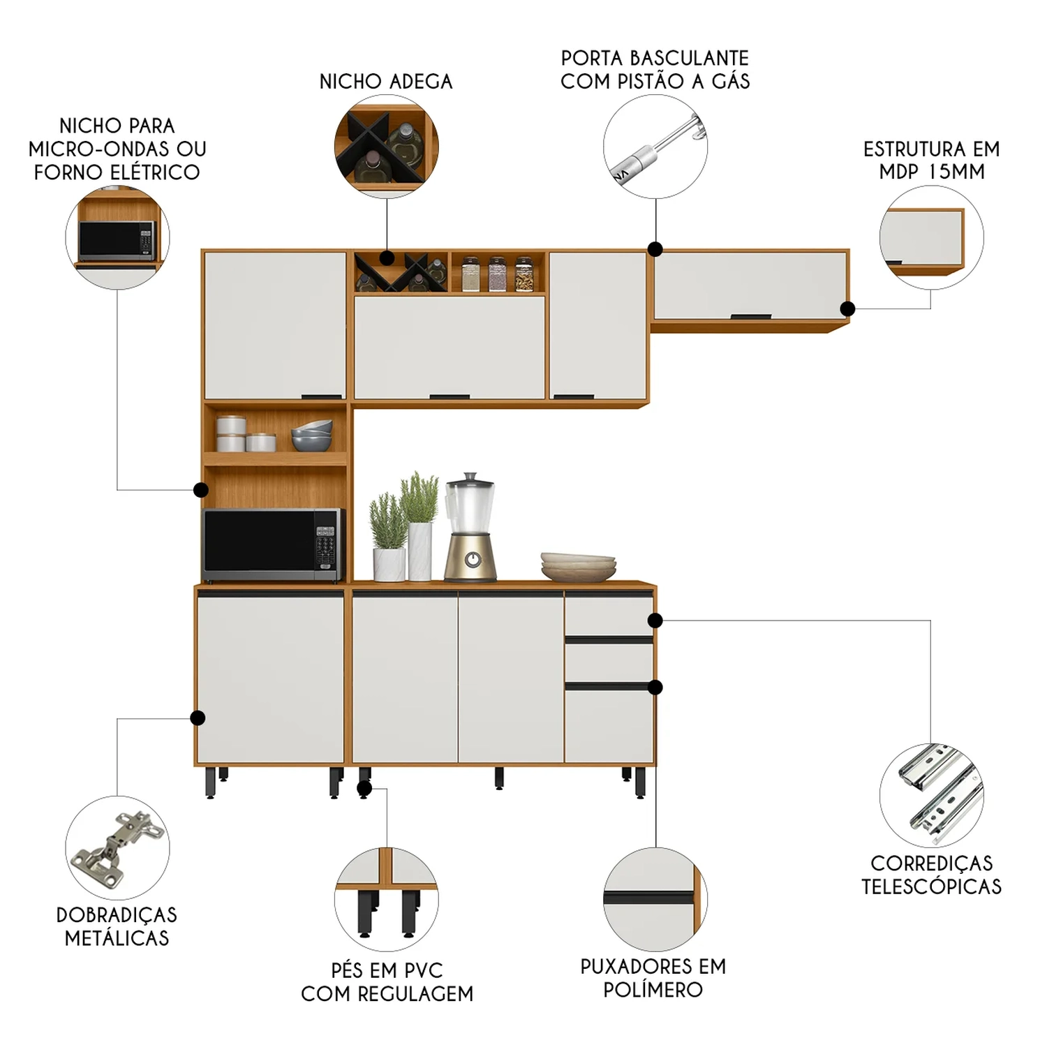 Os Armários Aéreos agregam ainda mais praticidade, com três portas, sendo uma convencional e duas basculantes com pistão a gás, além de um nicho decorativo e um nicho adega, ideal para exibir seus rótulos favoritos. Já o Balcão de Cozinha conta com três portas e duas gavetas com corrediças telescópicas, que permitem uma abertura total, facilitando o acesso aos itens armazenados.