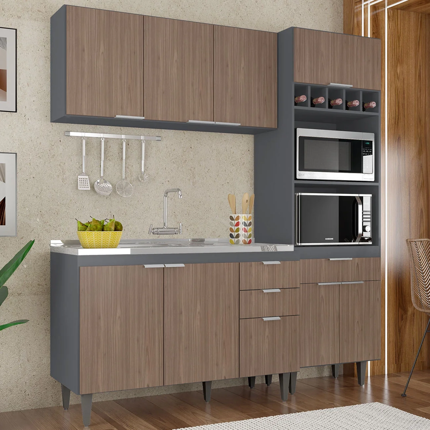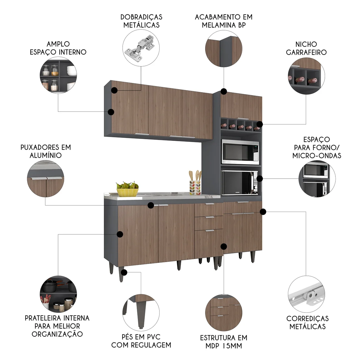 O Paneleiro conta com dois compartimentos para acomodar micro-ondas e forno elétrico, e cinco nichos na parte superior. Ele também inclui três portas, sendo uma delas basculante, além de uma gaveta. O Armário Aéreo vem com três portas e uma prateleira interna, para auxiliar na organização dos seus utensílios de forma prática e eficiente. Já o Balcão Gabinete dispõe de três portas e duas gavetas, com uma prateleira interna que oferece amplo espaço de armazenamento. Todos os móveis possuem estrutura em MDP 15mm, com acabamento em BP, puxadores em alumínio, dobradiças e corrediças metálicas, que garantem máxima resistência no uso diário. A Pia Inox apresenta um design ideal, que tem excelente desempenho no escoamento da água e possibilita o uso de diferentes objetos sobre ela. Os pés em PVC, são reguláveis, permitindo ajustar pequenos desníveis de piso. Este Armário de Cozinha é a solução perfeita para otimizar sua casa, combinando elegância e materiais de alta qualidade.