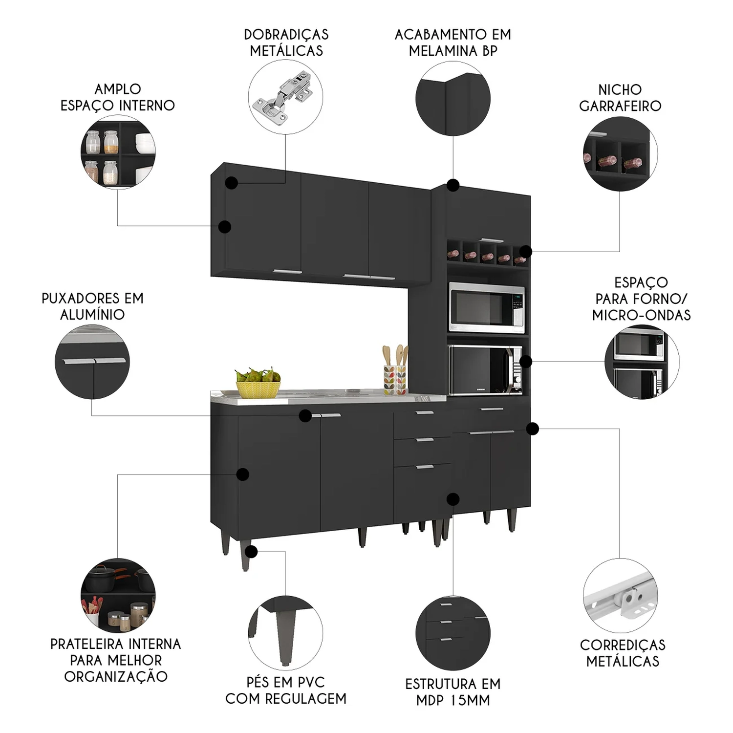 - Nichos para micro-ondas e forno elétrico.