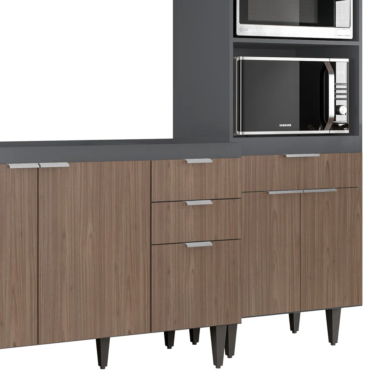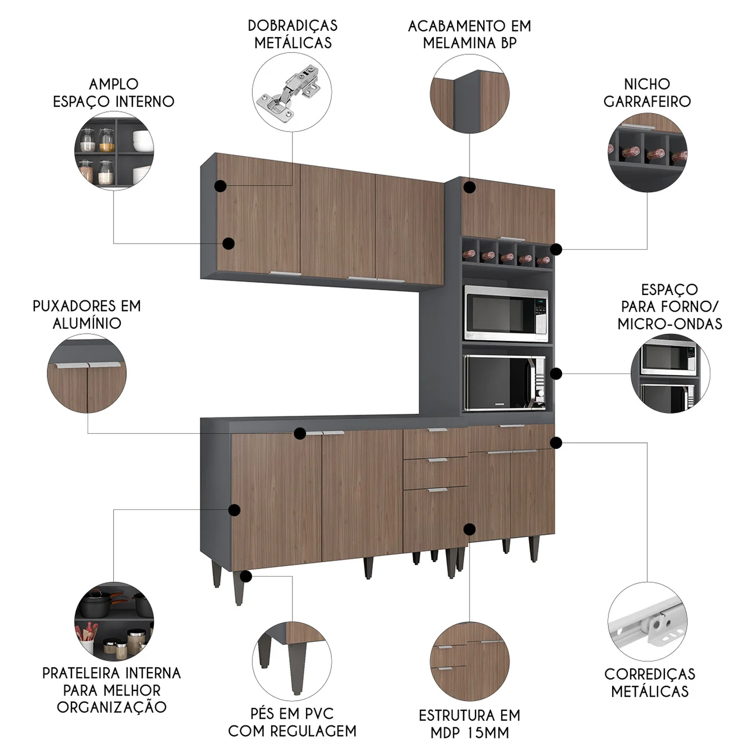 O Paneleiro conta com dois compartimentos para acomodar micro-ondas e forno elétrico, e cinco nichos na parte superior. Ele também inclui três portas, sendo uma delas basculante, além de uma gaveta. O Armário Aéreo vem com três portas e uma prateleira interna, para auxiliar na organização dos seus utensílios de forma prática e eficiente. Já o Balcão Para Pia dispõe de três portas e duas gavetas, com uma prateleira interna que oferece amplo espaço de armazenamento. Todos os móveis possuem estrutura em MDP 15mm, com acabamento em BP, puxadores em alumínio, dobradiças e corrediças metálicas, que garantem máxima resistência no uso diário. Os pés em PVC, são reguláveis, permitindo ajustar pequenos desníveis de piso. O balcão não acompanha tampo para que o uso fique opcional com tampo ou pia. Este Armário de Cozinha é a solução ideal para otimizar sua casa, combinando materiais de alta qualidade com um design sofisticado.