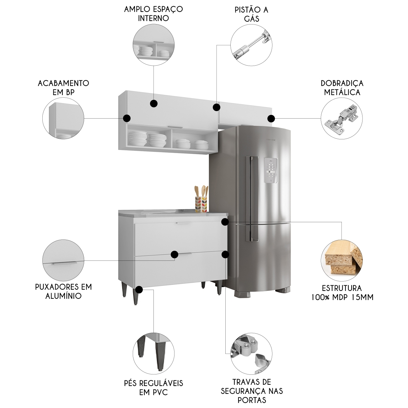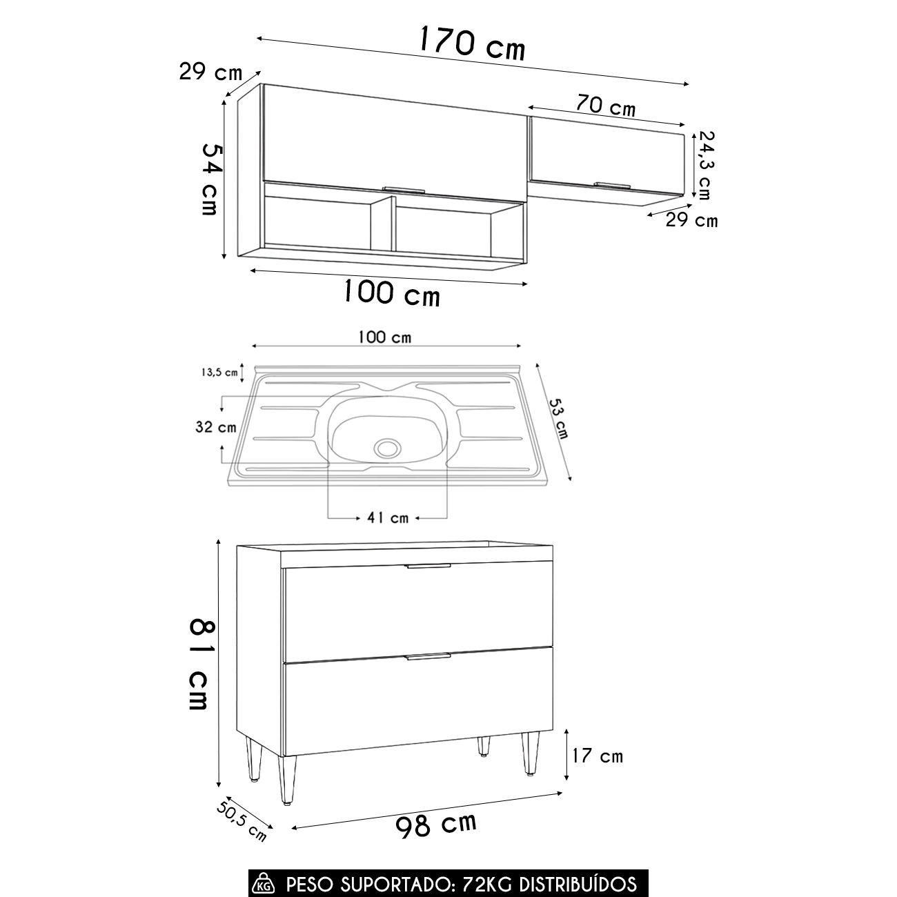 Conteúdo da Embalagem: 1 Armário Aéreo 100cm, 1 Armário Aéreo 70cm, 1 Balcão, 1 Pia.