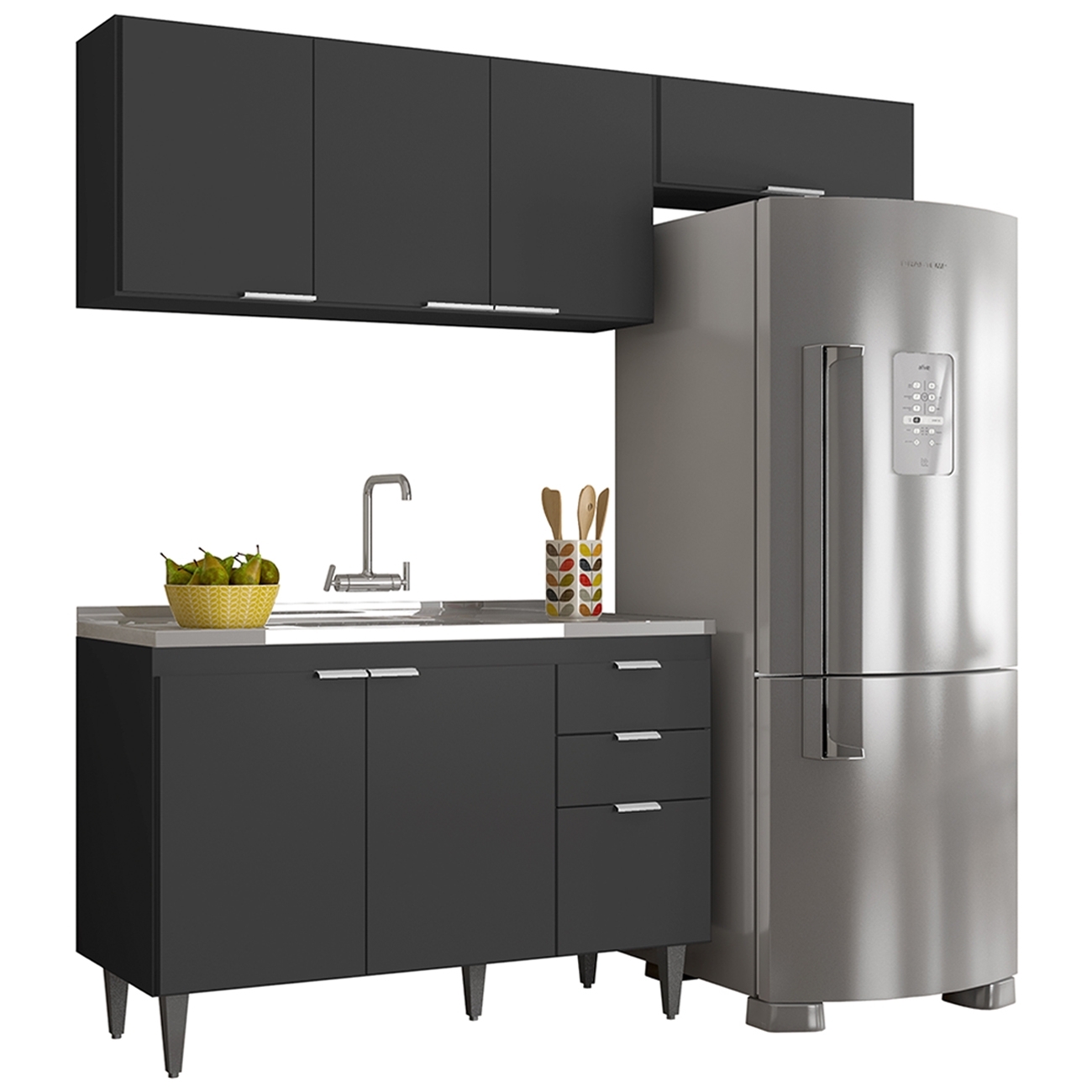 Conteúdo da Embalagem: 1 Armário Aéreo 120cm, 1 Armário Aéreo 70cm, 1 Balcão, 1 Pia.