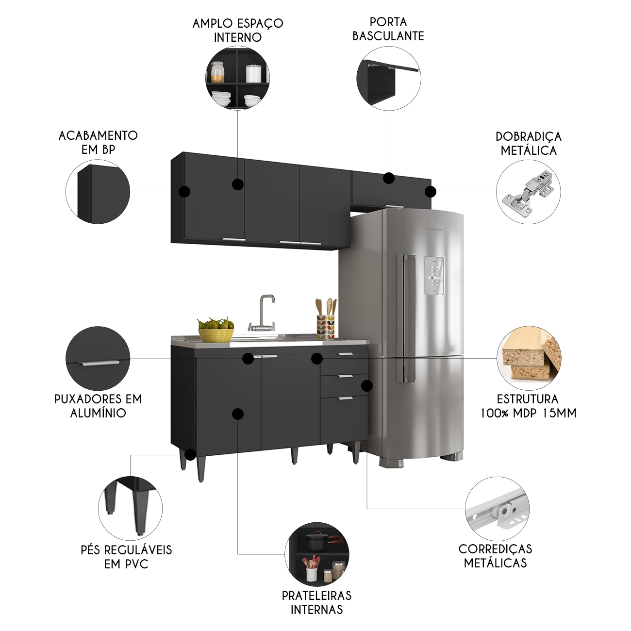 O Armário Aéreo 120cm conta com três portas convencionais e uma prateleira interna, enquanto o Armário de Geladeira vem com uma porta basculante, para auxiliar na organização dos seus utensílios de forma prática e eficiente. Já o Balcão Gabinete dispõe de três portas e duas gavetas, com uma prateleira interna que oferece amplo espaço de armazenamento. Todos os móveis possuem estrutura em MDP 15mm, com acabamento em BP, puxadores em alumínio, dobradiças e corrediças metálicas, que garantem máxima resistência no uso diário. A Pia Inox apresenta um design ideal, que tem excelente desempenho no escoamento da água e possibilita o uso de diferentes objetos sobre ela. Os pés em PVC, são reguláveis, permitindo ajustar pequenos desníveis de piso. Este Armário de Cozinha é a solução perfeita para otimizar sua casa, combinando elegância e materiais de alta qualidade.