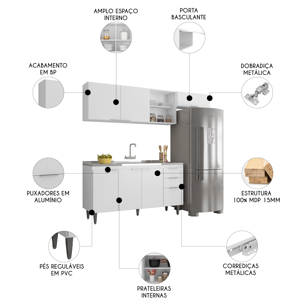 Conteúdo da Embalagem: 1 Armário Aéreo 150cm, 1 Armário Aéreo 70cm, 1 Balcão, 1 Pia.