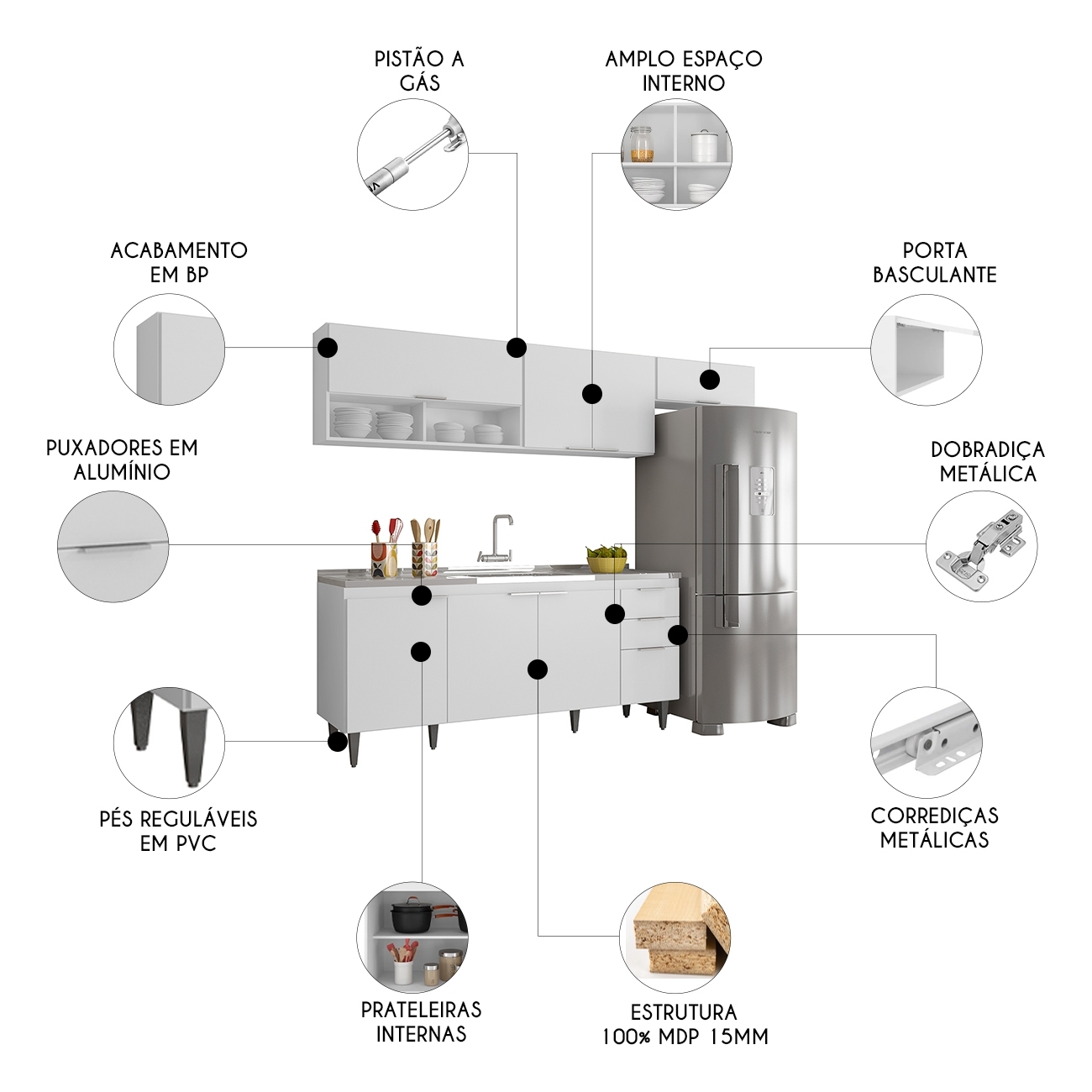 O Armário Aéreo 100cm vem com uma porta com pistão a gás e dois nichos, que se destacam na composição. O Armário de Geladeira também com uma porta, é um ótimo complemento, agregando praticidade e estilo. Enquanto o Armário Aéreo 80cm conta com duas portas convencionais, com uma prateleira interna para auxiliar na organização dos seus utensílios de forma prática e eficiente. Já o Balcão Gabinete dispõe de quatro portas e duas gavetas, com uma prateleira interna, oferecendo amplo espaço de armazenamento. Todos os móveis possuem estrutura em MDP 15mm, com acabamento em BP, puxadores em alumínio, dobradiças e corrediças metálicas, que garantem máxima resistência no uso diário. A Pia Inox apresenta um design ideal, que tem excelente desempenho no escoamento da água e possibilita o uso de diferentes objetos sobre ela. Os pés em PVC, são reguláveis, permitindo ajustar pequenos desníveis de piso. Este Armário de Cozinha é a solução perfeita para otimizar sua casa, combinando elegância e materiais de alta qualidade.