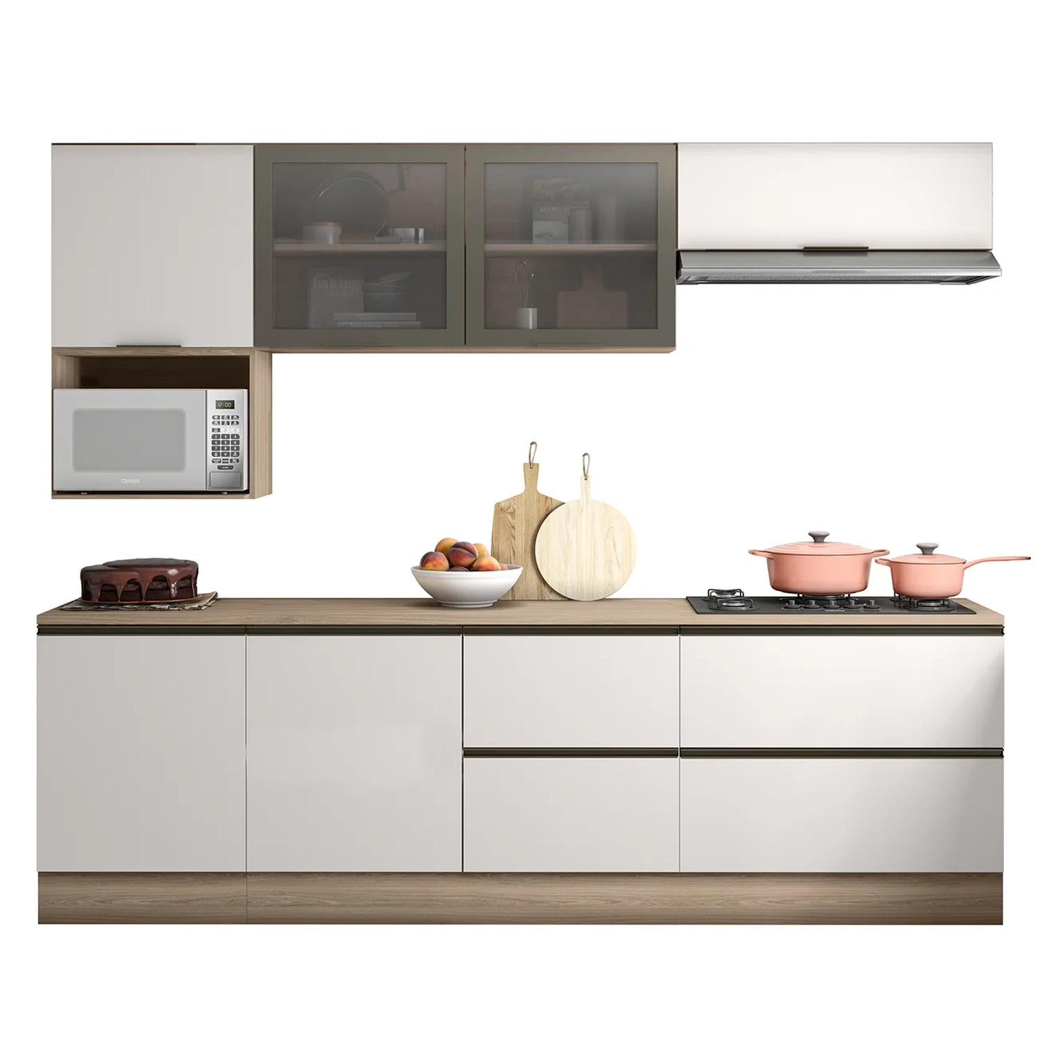 Os Armários Aéreos vem com três portas, sendo duas com moldura e vidro fumê, que agregam um toque de sofisticação. Já o Armário de Geladeira possui uma porta basculante com pistão a gás. Inclui também um nicho ideal para acomodar micro-ondas ou forno elétrico, otimizando o espaço disponível.