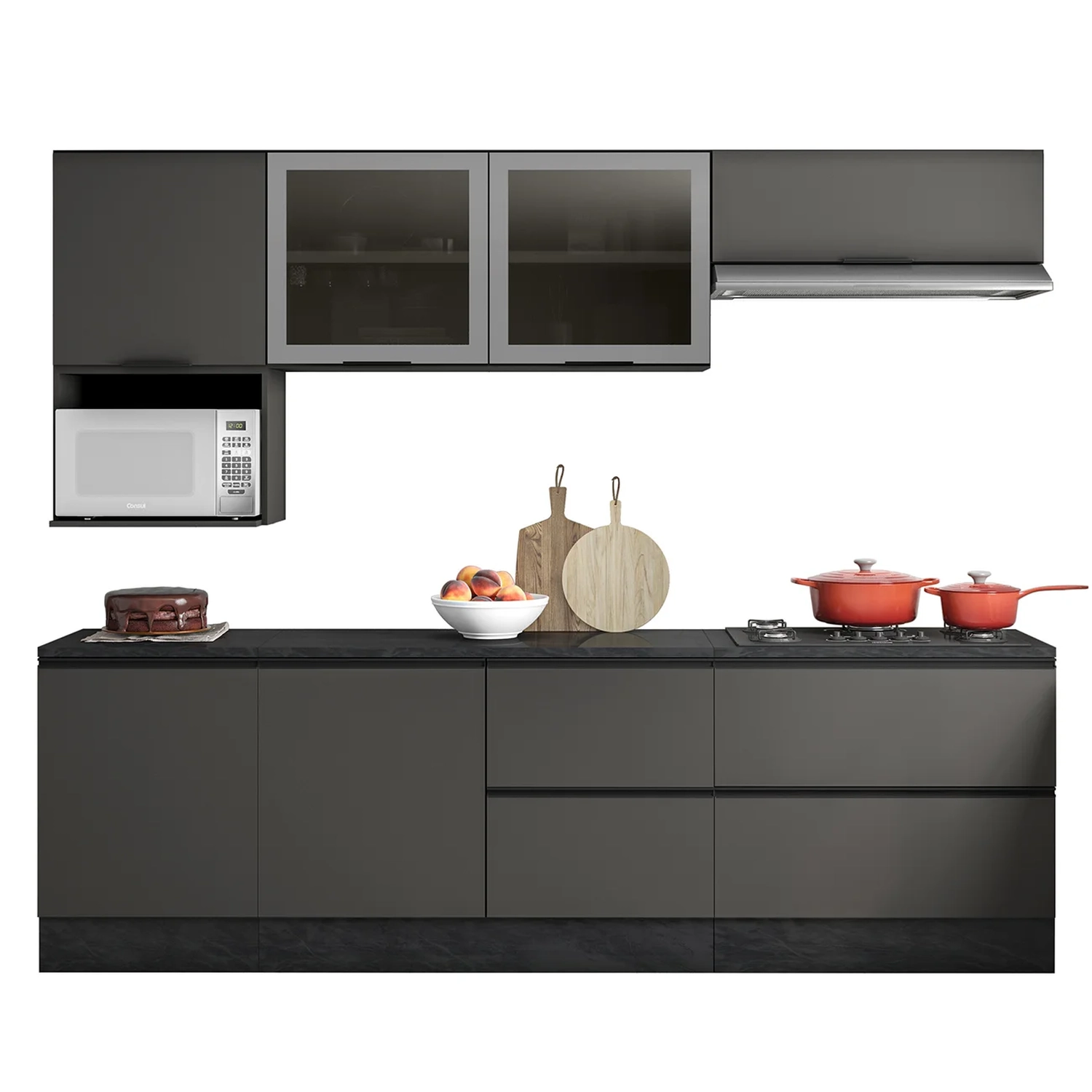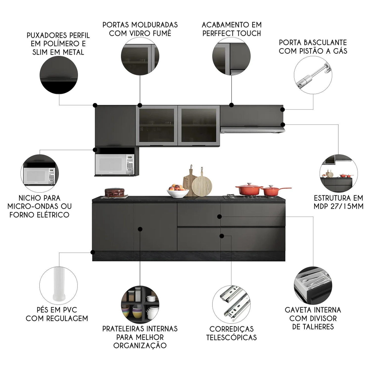 Os Armários Aéreos vem com três portas, sendo duas com moldura e vidro fumê, que agregam um toque de sofisticação. Já o Armário de Geladeira possui uma porta basculante com pistão a gás. Inclui também um nicho ideal para acomodar micro-ondas ou forno elétrico, otimizando o espaço disponível.