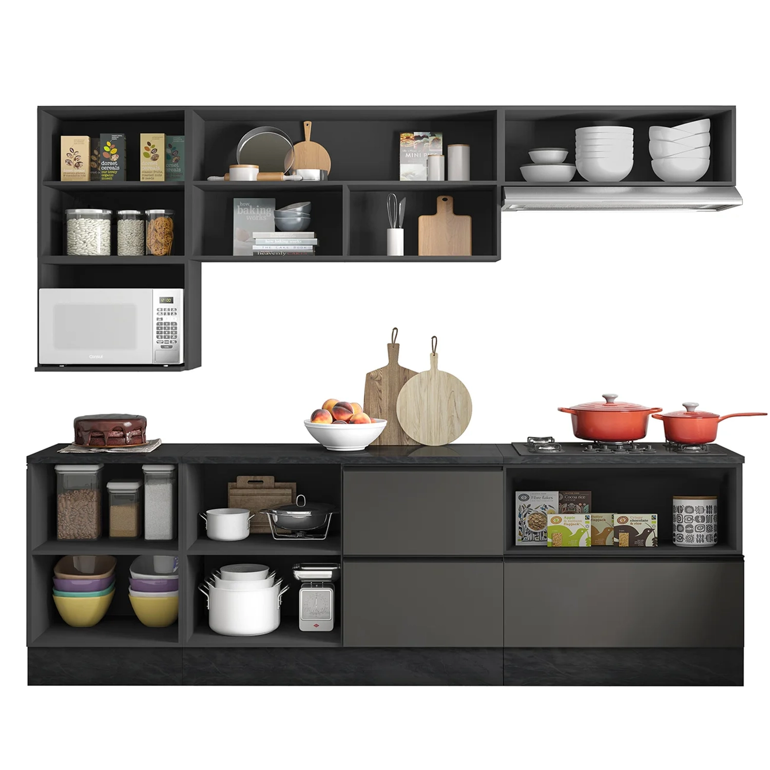 O tampo serve como apoio para pequenos eletros e itens que precisam estar sempre à mão. Com ótimo espaço interno, o conjunto dispõe de duas prateleiras que ajudam a organizar utensílios e mantimentos de forma eficiente. As dobradiças metálicas e corrediças telescópicas proporcionam abertura suave e durabilidade no uso contínuo.