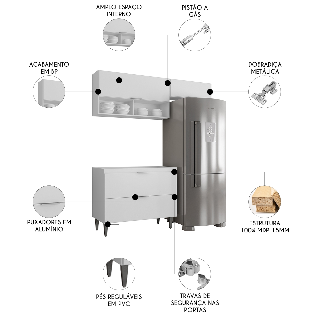 O Armário Aéreo 100cm vem com uma porta basculante com pistão a gás e dois nichos, que se destacam com elegância na composição do ambiente. Enquanto o Armário de Geladeira, também com uma porta, é um ótimo complemento, agregando praticidade e estilo. Já o Balcão Para Pia dispõe de duas portas basculantes com fecho trava de segurança, que permite o fechamento com um simples toque. Todos os móveis possuem estrutura em MDP 15mm, com acabamento em BP, puxadores em alumínio e dobradiças metálicas, que garantem máxima resistência no uso diário. Os pés em PVC, são reguláveis, permitindo ajustar pequenos desníveis de piso. O balcão não acompanha tampo para que o uso fique opcional com tampo ou pia. Este Armário de Cozinha é a solução ideal para otimizar sua casa, combinando materiais de alta qualidade com um design sofisticado.