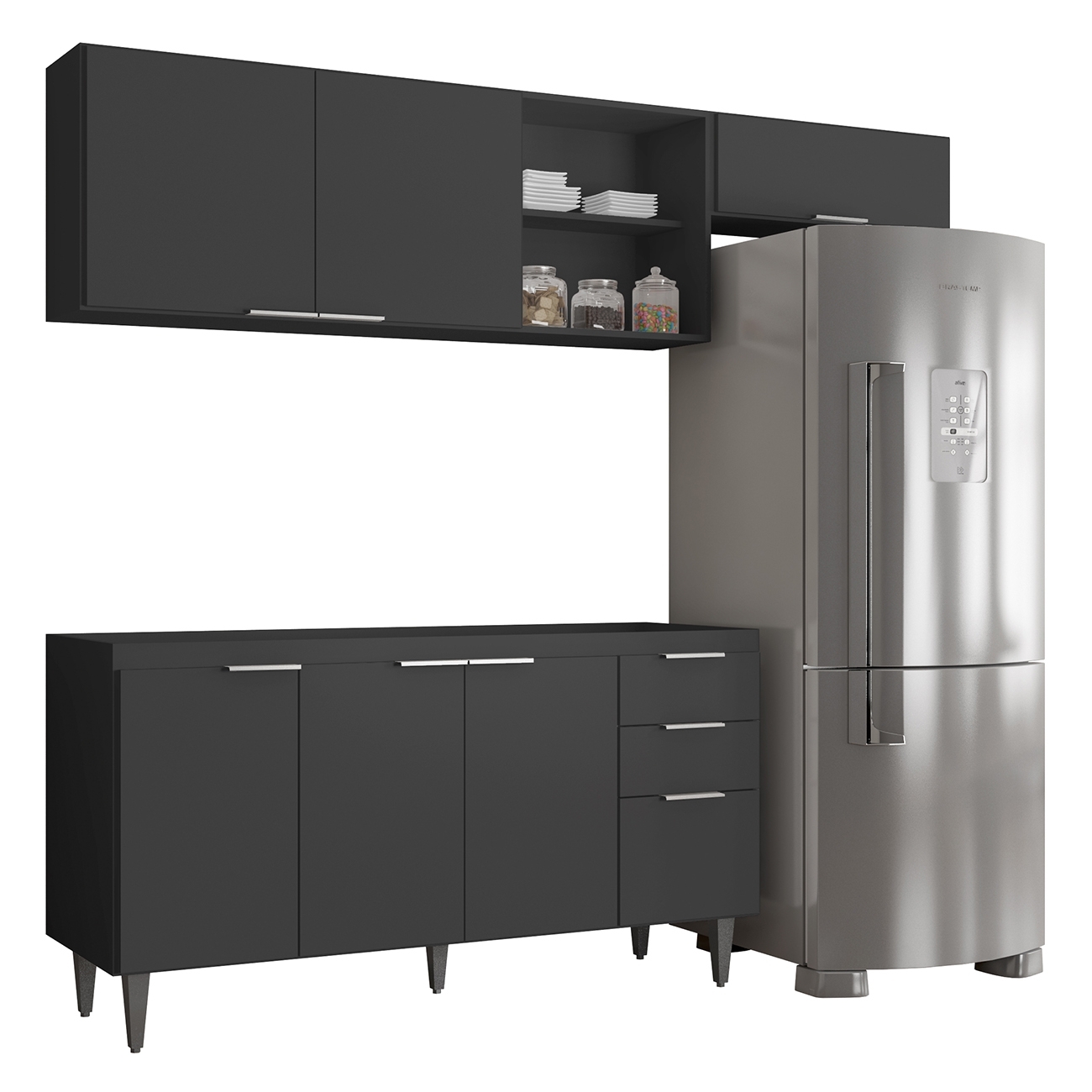 Conteúdo da Embalagem: 1 Armário Aéreo 150cm, 1 Armário Aéreo 70cm, 1 Balcão.