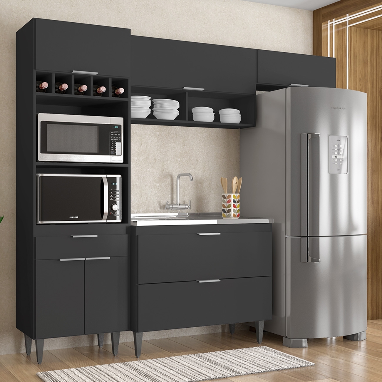 O Paneleiro conta com dois compartimentos para acomodar micro-ondas e forno elétrico, e cinco nichos na parte superior. Ele também inclui três portas, sendo uma delas basculante, além de uma gaveta para melhor organização dos seus utensílios. O Armário Aéreo 100cm vem com uma porta basculante com pistão a gás e dois nichos, que se destacam na composição do ambiente. Enquanto o Armário de Geladeira, também com uma porta, é um ótimo complemento, agregando praticidade e estilo. Já o Balcão Gabinete dispõe de duas portas basculantes com fecho trava de segurança, que permite o fechamento com um simples toque. Todos os móveis possuem estrutura em MDP 15mm, com acabamento em BP, puxadores em alumínio, dobradiças e corrediças metálicas, que garantem máxima resistência no uso diário. A Pia Inox apresenta um design ideal, que tem excelente desempenho no escoamento da água e possibilita o uso de diferentes objetos sobre ela. Os pés em PVC, são reguláveis, permitindo ajustar pequenos desníveis de piso. Este Armário de Cozinha é a solução perfeita para otimizar sua casa, combinando elegância e materiais de alta qualidade.