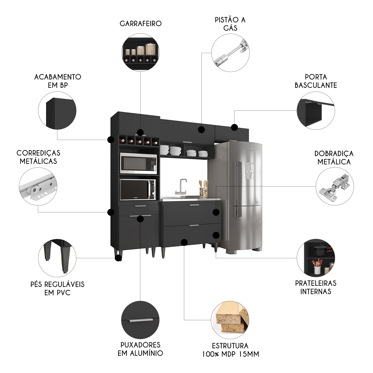 - Nichos para micro-ondas e forno elétrico.