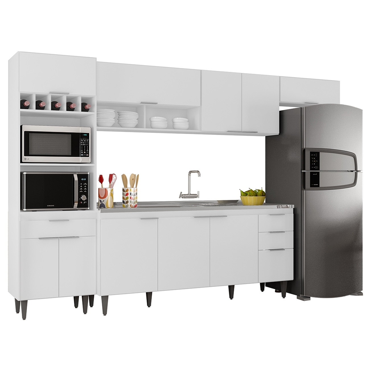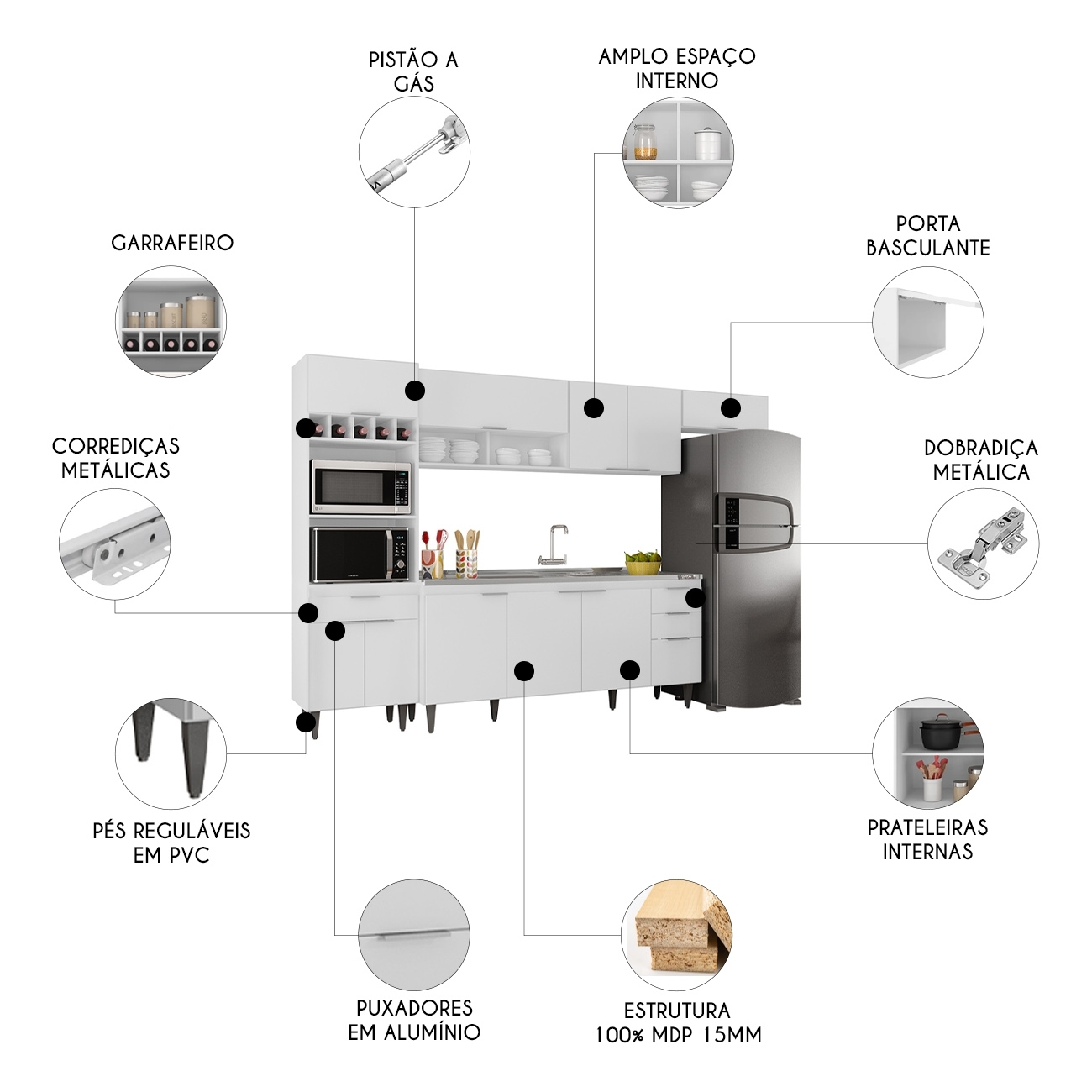 Características do Produto Material da Estrutura: MDP 15mm. Material do fundo: HDF 3mm. Peso Suportado: 151 Kg distribuídos. Acompanha Pia: Sim. Acompanha Tampo: Não. Acabamento: Melamina BP. Escala de brilho: Fosco. Possui Portas: Sim. Quantidade de Portas: 11 Portas. Tipo de Porta: Convencional/Basculante. Tipo de Dobradiças: Metálicas. Possui Gavetas: Sim. Quantidade de Gavetas: 3 Gavetas. Tipo de Corrediças: Metálicas. Possui Puxador: Sim. Material do Puxador: Alumínio. Possui Prateleiras: Sim. Quantidade de Prateleiras: 2 Prateleiras. Possui Nichos: Sim. Quantidade de Nichos: 9 Nichos. Possui Pés: Sim. Quantidade de Pés: 10 Pés. Material dos Pés: PVC. Altura dos Pés: 17cm com regulagem. Diferenciais: