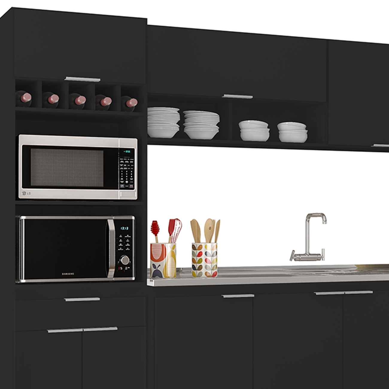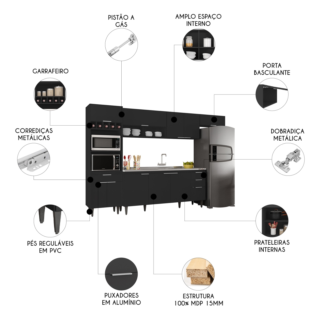 O Paneleiro conta com dois compartimentos para acomodar micro-ondas e forno elétrico, e cinco nichos na parte superior. Ele também inclui três portas, sendo uma delas basculante, além de uma gaveta para melhor organização dos seus utensílios. O Armário Aéreo 100cm vem com uma porta basculante com pistão a gás e dois nichos, que se destacam com elegância. O com uma porta, é um ótimo complemento, agregando praticidade e estilo. Já o Armário Aéreo 80cm dispõe de duas portas convencionais, com uma prateleira interna. O Balcão Gabinete conta com quatro portas e duas gavetas, com uma prateleira interna que oferece amplo espaço de armazenamento. Todos os móveis possuem estrutura em MDP 15mm, com acabamento em BP, puxadores em alumínio, dobradiças e corrediças metálicas, que garantem máxima resistência no uso diário. A Pia Inox apresenta um design ideal, que tem excelente desempenho no escoamento da água e possibilita o uso de diferentes objetos sobre ela. Os pés em PVC, são reguláveis, permitindo ajustar pequenos desníveis de piso. Este Armário de Cozinha é a solução perfeita para otimizar sua casa, combinando sofisticação e materiais de alta qualidade.