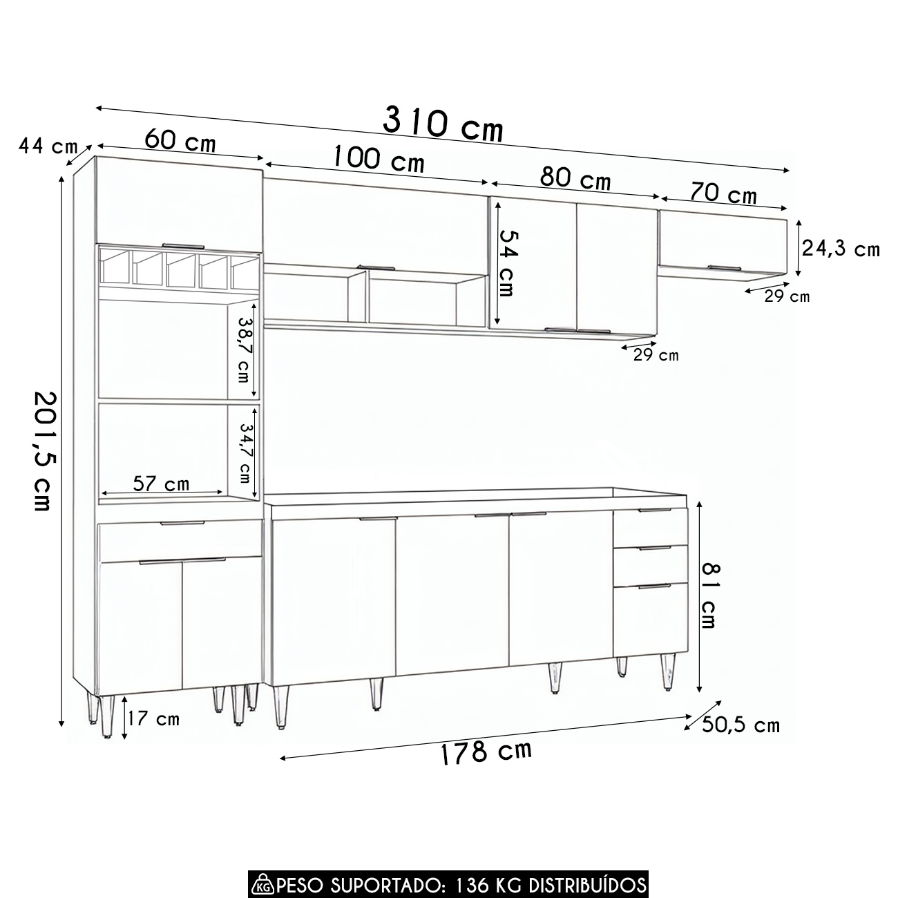 Outras medidas: (L x A x P) Armário Aéreo 100cm: 100 x 54 x 29 cm. Armário Aéreo 80cm: 80 x 54 x 29 cm. Armário Aéreo 70cm: 70 x 24,3 x 29 cm. Balcão 178 x 81 x 50,5 cm. Paneleiro: 60 x 201,5 x 44 cm.