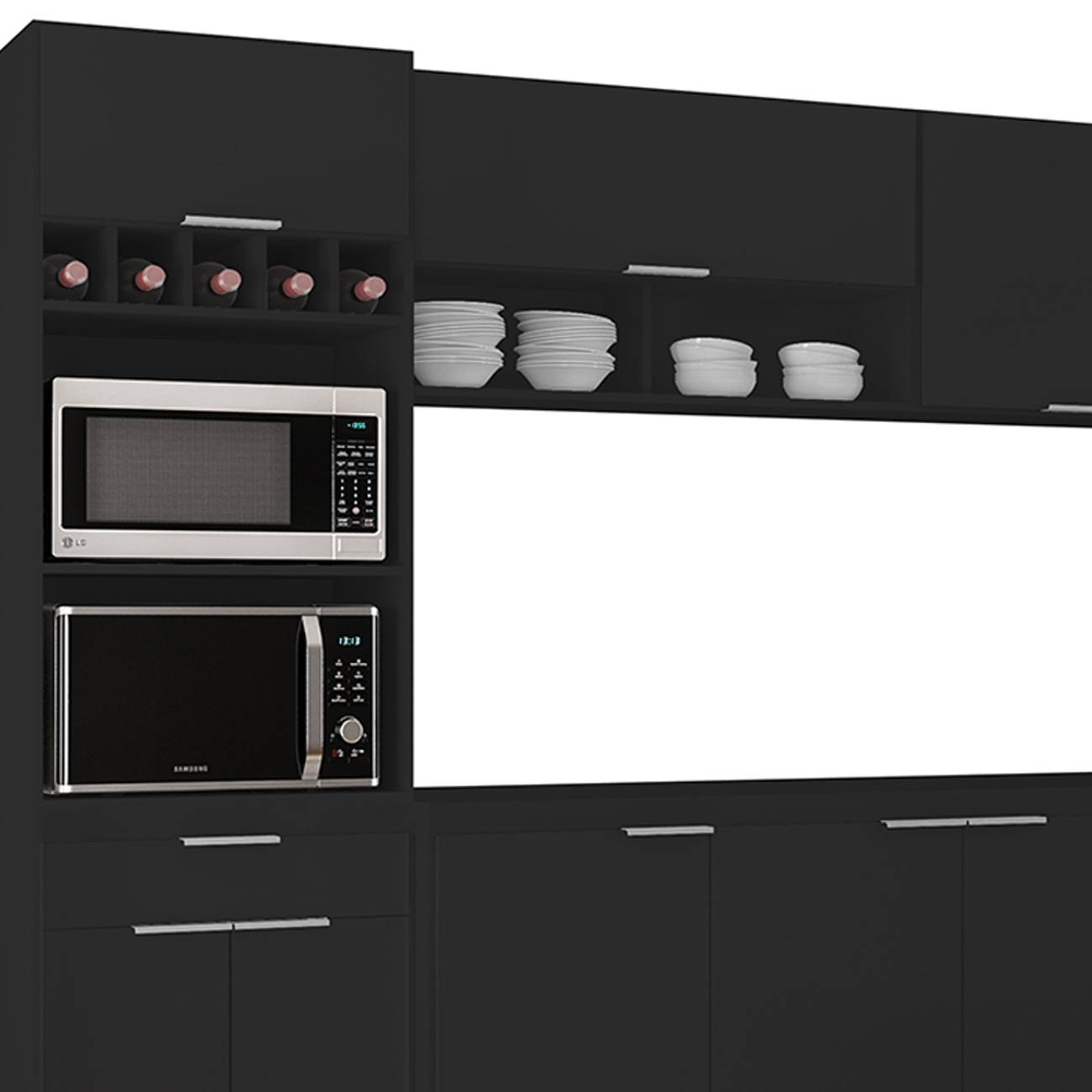 O Paneleiro conta com dois compartimentos para acomodar micro-ondas e forno elétrico, e cinco nichos na parte superior. Ele também inclui três portas, sendo uma delas basculante, além de uma gaveta para melhor organização dos seus utensílios. O Armário Aéreo 100cm vem com uma porta basculante com pistão a gás e dois nichos, que se destacam com elegância. O com uma porta, é um ótimo complemento, agregando praticidade e estilo. Já o Armário Aéreo 80cm dispõe de duas portas convencionais, com uma prateleira interna. O Balcão Para Pia conta com quatro portas e duas gavetas, com uma prateleira interna que oferece amplo espaço de armazenamento. Todos os móveis possuem estrutura em MDP 15mm, com acabamento em BP, puxadores em alumínio, dobradiças e corrediças metálicas, que garantem máxima resistência no uso diário. Os pés em PVC, são reguláveis, permitindo ajustar pequenos desníveis de piso. O balcão não acompanha tampo para que o uso fique opcional com tampo ou pia. Este Armário de Cozinha é a solução ideal para otimizar sua casa, combinando materiais de alta qualidade com um design sofisticado.