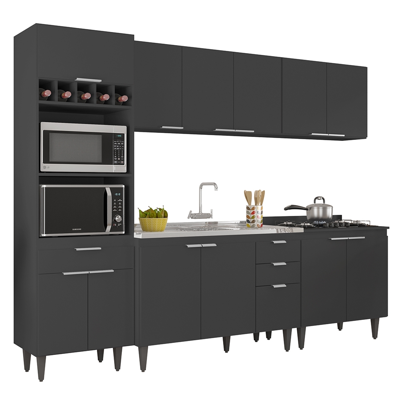 O Paneleiro conta com dois compartimentos para acomodar micro-ondas e forno elétrico, e cinco nichos na parte superior. Ele também inclui três portas, sendo uma delas basculante, além de uma gaveta para melhor organização dos seus utensílios. Os Armários Aéreos dispõe de cinco portas e duas prateleiras internas, oferecendo praticidade e estilo. Já o Balcão Gabinete e o Balcão 80cm com Tampo possuem cinco portas e duas gavetas, com duas prateleiras internas que proporcionam amplo espaço de armazenamento. Todos os móveis possuem estrutura em MDP 15mm, com acabamento em BP, puxadores em alumínio, dobradiças e corrediças metálicas, que garantem máxima resistência no uso diário. A Pia Inox apresenta um design ideal, que tem excelente desempenho no escoamento da água e possibilita o uso de diferentes objetos sobre ela. Os pés em PVC, são reguláveis, permitindo ajustar pequenos desníveis de piso. Este Armário de Cozinha é a solução perfeita para otimizar sua casa, combinando elegância e materiais de alta qualidade.