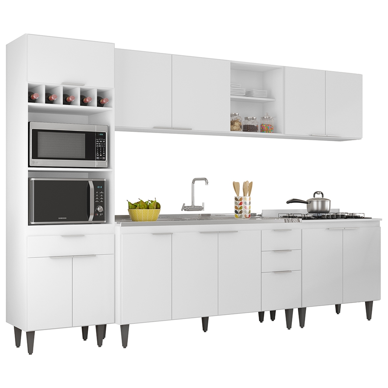 O Paneleiro conta com dois compartimentos para acomodar micro-ondas e forno elétrico, e cinco nichos na parte superior. Ele também inclui três portas, sendo uma delas basculante, além de uma gaveta para melhor organização dos seus utensílios. Os Armários Aéreos dispõe de quatro portas, dois nichos laterais e duas prateleiras internas, agregando praticidade e estilo. Já o Balcão Gabinete e o Balcão 80cm com Tampo possuem seis portas e duas gavetas, com duas prateleiras internas que oferecem amplo espaço de armazenamento. Todos os móveis possuem estrutura em MDP 15mm, com acabamento em BP, puxadores em alumínio, dobradiças e corrediças metálicas, que garantem máxima resistência no uso diário. A Pia Inox apresenta um design ideal, que tem excelente desempenho no escoamento da água e possibilita o uso de diferentes objetos sobre ela. Os pés em PVC, são reguláveis, permitindo ajustar pequenos desníveis de piso. Este Armário de Cozinha é a solução perfeita para otimizar sua casa, combinando elegância e materiais de alta qualidade.