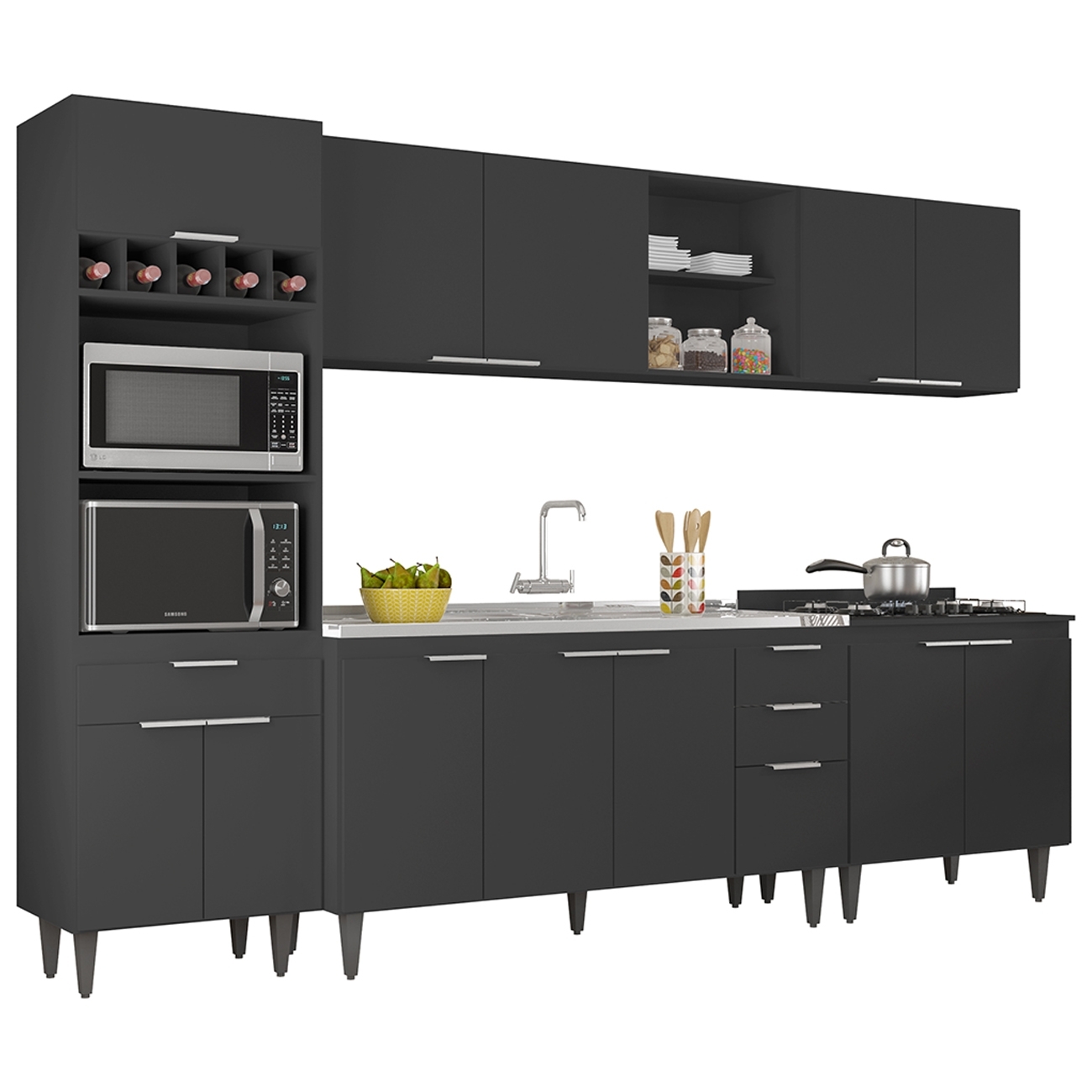 O Paneleiro conta com dois compartimentos para acomodar micro-ondas e forno elétrico, e cinco nichos na parte superior. Ele também inclui três portas, sendo uma delas basculante, além de uma gaveta para melhor organização dos seus utensílios. Os Armários Aéreos dispõe de quatro portas, dois nichos laterais e duas prateleiras internas, agregando praticidade e estilo. Já o Balcão Gabinete e o Balcão 80cm com Tampo possuem seis portas e duas gavetas, com duas prateleiras internas que oferecem amplo espaço de armazenamento. Todos os móveis possuem estrutura em MDP 15mm, com acabamento em BP, puxadores em alumínio, dobradiças e corrediças metálicas, que garantem máxima resistência no uso diário. A Pia Inox apresenta um design ideal, que tem excelente desempenho no escoamento da água e possibilita o uso de diferentes objetos sobre ela. Os pés em PVC, são reguláveis, permitindo ajustar pequenos desníveis de piso. Este Armário de Cozinha é a solução perfeita para otimizar sua casa, combinando elegância e materiais de alta qualidade.
