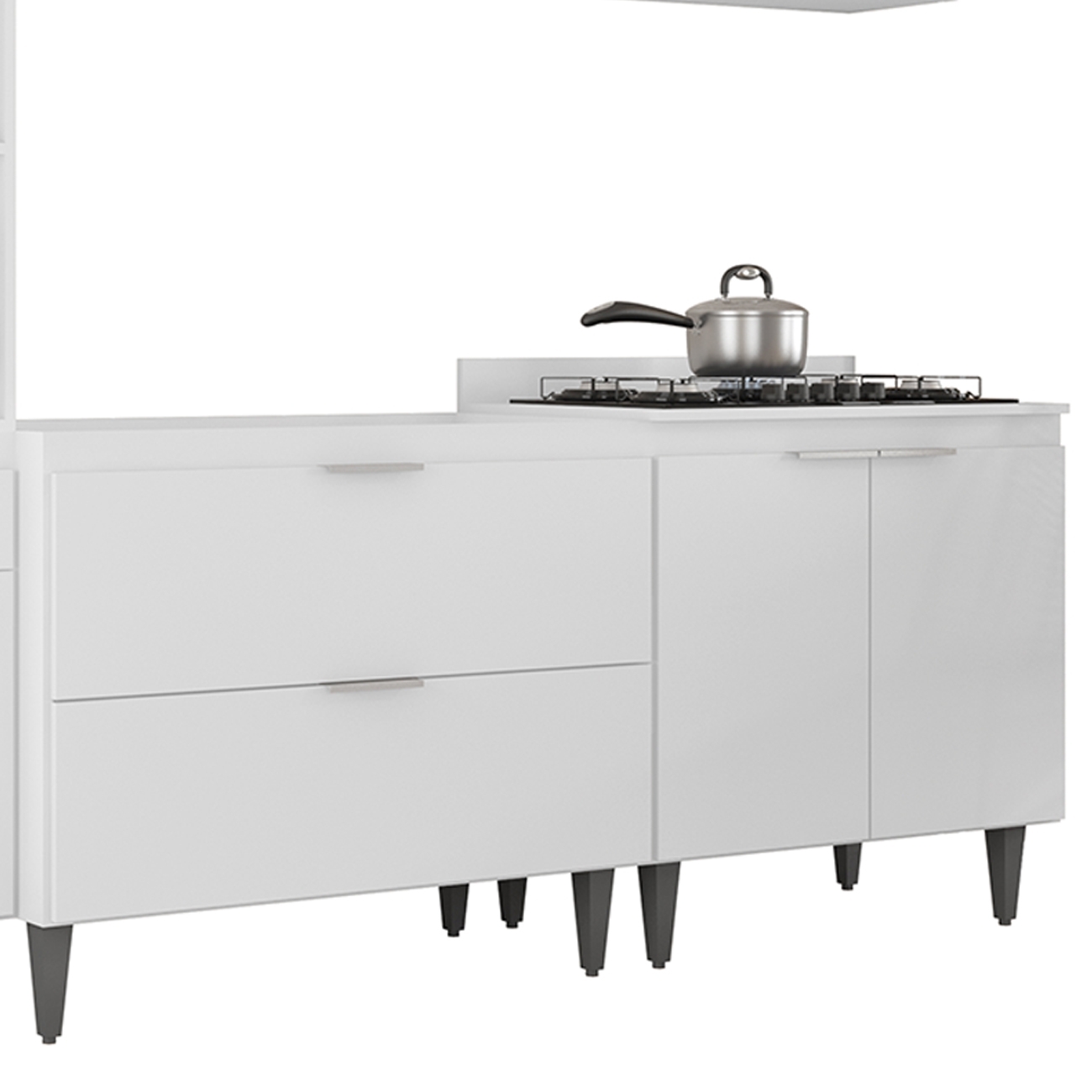 O Paneleiro conta com dois compartimentos para acomodar micro-ondas e forno elétrico, e cinco nichos na parte superior. Ele também inclui três portas, sendo uma delas basculante, além de uma gaveta para melhor organização dos seus utensílios. O Armário Aéreo 100cm possui uma porta basculante com pistão a gás e dois nichos, que se destacam com elegância. O Armário Aéreo 80cm dispõe de duas portas convencionais, com uma prateleira interna, agregando praticidade e estilo. Já o Balcão Para Pia vem com duas portas basculantes com fecho trava de segurança, que permite o fechamento com um simples toque. Enquanto o Balcão 80cm com Tampo conta com duas portas convencionais, com uma prateleira interna, oferecendo amplo espaço de armazenamento. Todos os móveis possuem estrutura em MDP 15mm, com acabamento em BP, puxadores em alumínio, dobradiças e corrediças metálicas, que garantem máxima resistência no uso diário. Os pés em PVC, são reguláveis, permitindo ajustar pequenos desníveis de piso. O balcão gabinete não acompanha tampo para que o uso fique opcional com tampo ou pia. Este Armário de Cozinha é a solução ideal para otimizar sua casa, combinando materiais de alta qualidade com um design sofisticado.