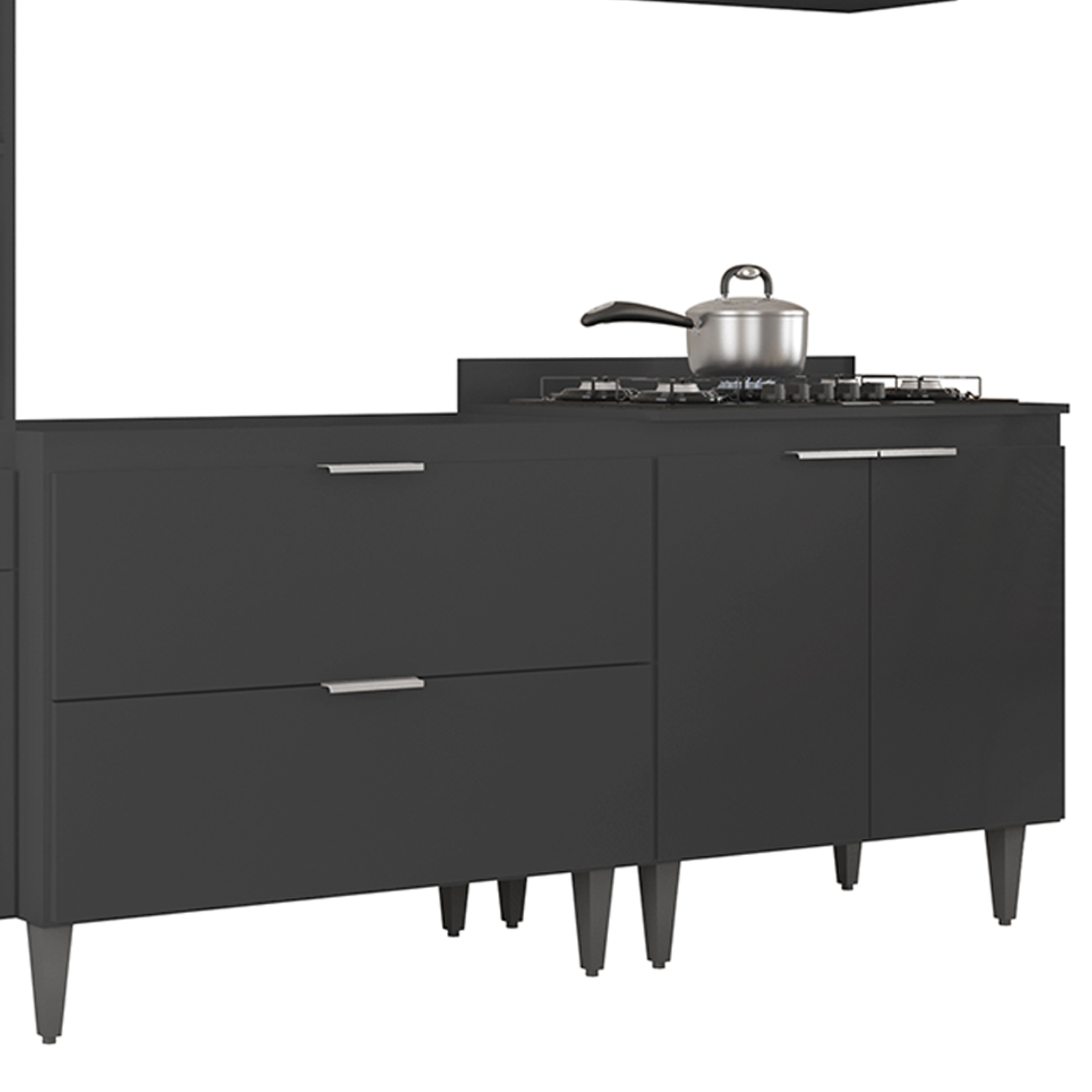 O Paneleiro conta com dois compartimentos para acomodar micro-ondas e forno elétrico, e cinco nichos na parte superior. Ele também inclui três portas, sendo uma delas basculante, além de uma gaveta para melhor organização dos seus utensílios. O Armário Aéreo 100cm possui uma porta basculante com pistão a gás e dois nichos, que se destacam com elegância. O Armário Aéreo 80cm dispõe de duas portas convencionais, com uma prateleira interna, agregando praticidade e estilo. Já o Balcão Para Pia vem com duas portas basculantes com fecho trava de segurança, que permite o fechamento com um simples toque. Enquanto o Balcão 80cm com Tampo conta com duas portas convencionais, com uma prateleira interna, oferecendo amplo espaço de armazenamento. Todos os móveis possuem estrutura em MDP 15mm, com acabamento em BP, puxadores em alumínio, dobradiças e corrediças metálicas, que garantem máxima resistência no uso diário. Os pés em PVC, são reguláveis, permitindo ajustar pequenos desníveis de piso. O balcão gabinete não acompanha tampo para que o uso fique opcional com tampo ou pia. Este Armário de Cozinha é a solução ideal para otimizar sua casa, combinando materiais de alta qualidade com um design sofisticado.