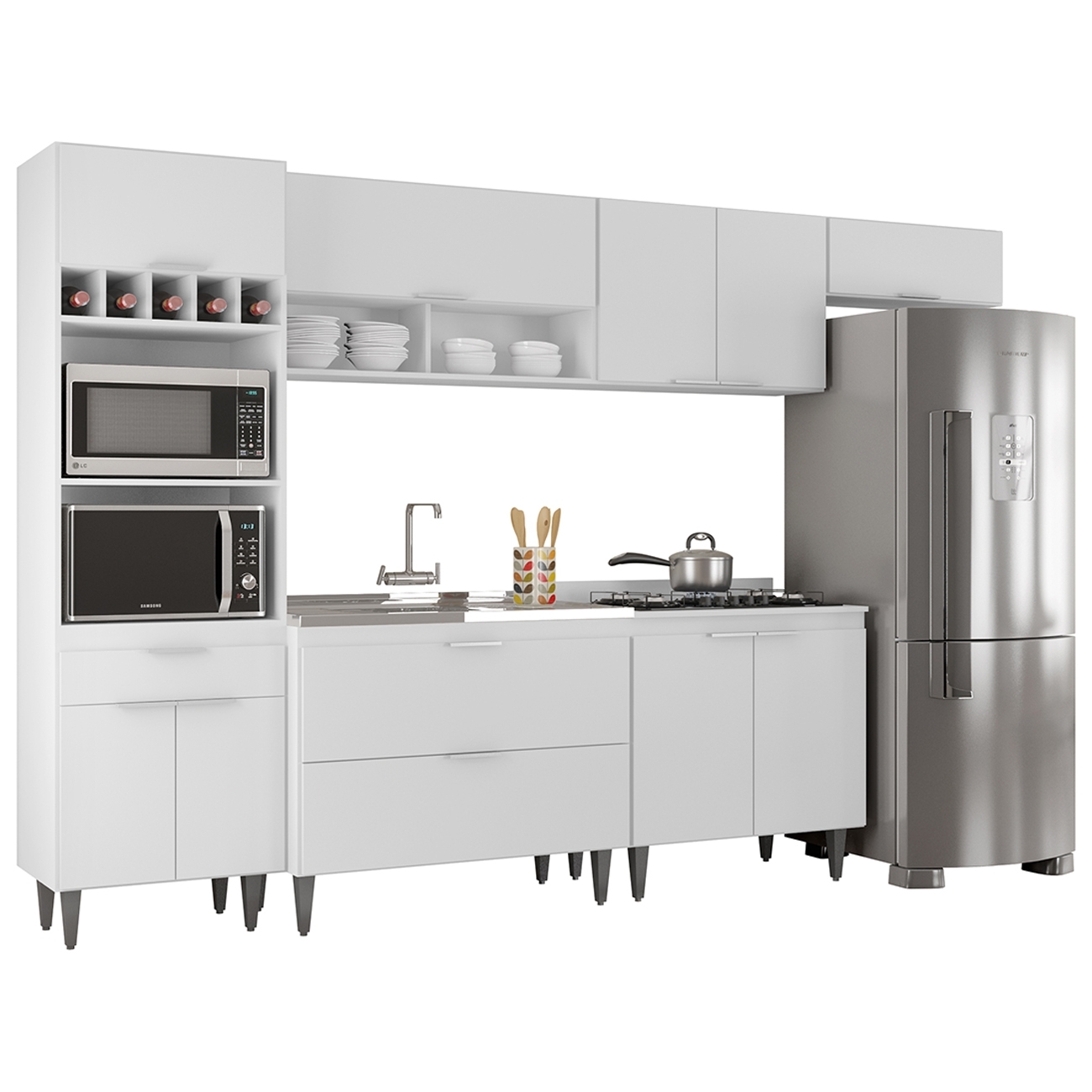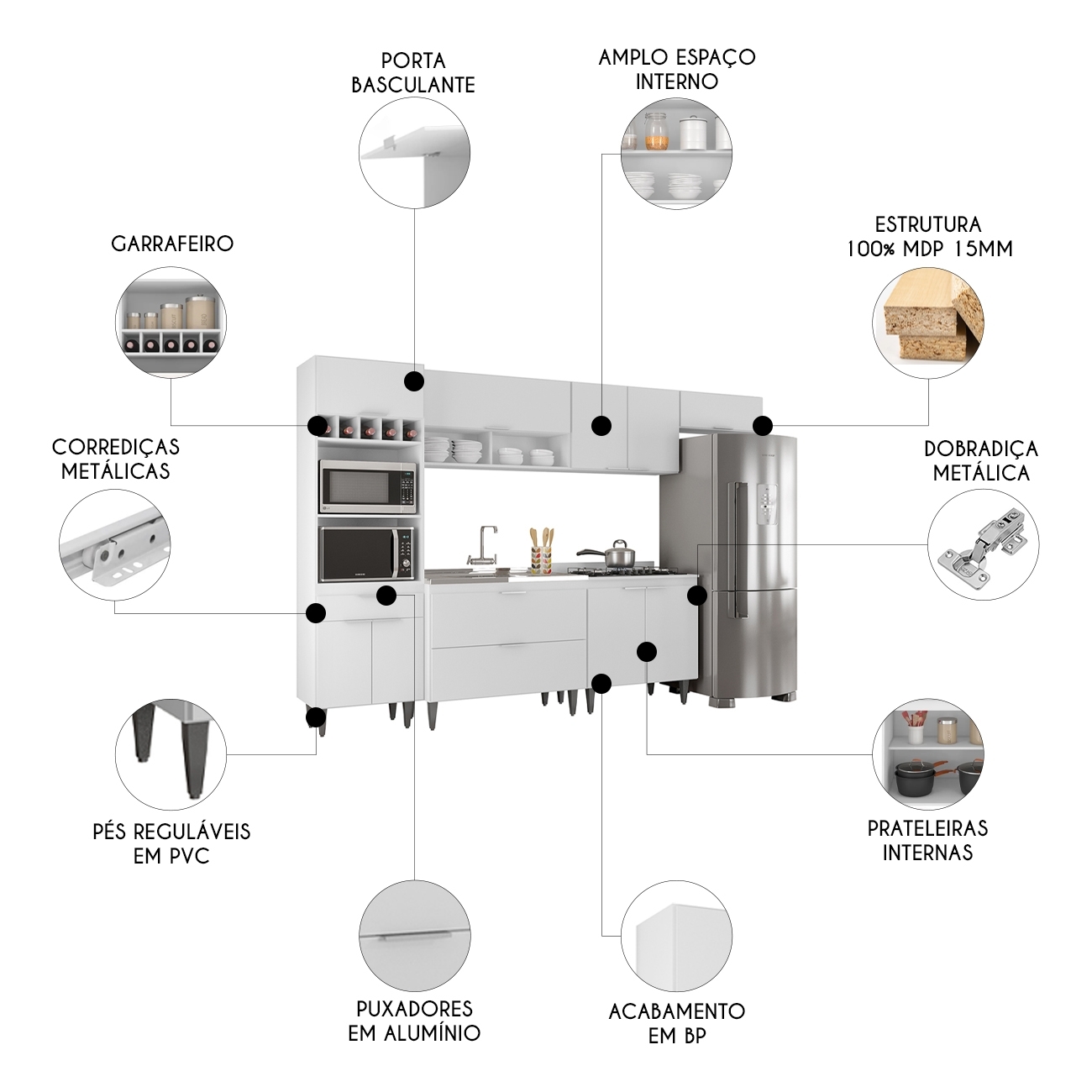 Características do Produto Material da Estrutura: MDP 15mm. Material do fundo: HDF 3mm. Peso Suportado: 180 Kg distribuídos. Acompanha Pia: Sim. Acompanha Tampo: Não. Acabamento: Melamina BP. Escala de brilho: Fosco. Possui Portas: Sim. Quantidade de Portas: 11 Portas. Tipo de Porta: Convencional/Basculante. Tipo de Dobradiças: Metálicas. Possui Gavetas: Sim. Quantidade de Gavetas: 1 Gaveta. Tipo de Corrediças: Metálicas. Possui Puxador: Sim. Material do Puxador: Alumínio. Possui Prateleiras: Sim. Quantidade de Prateleiras: 2 Prateleiras. Possui Nichos: Sim. Quantidade de Nichos: 9 Nichos. Possui Pés: Sim. Quantidade de Pés: 12 Pés. Material dos Pés: PVC. Altura dos Pés: 17cm com regulagem. Diferenciais: