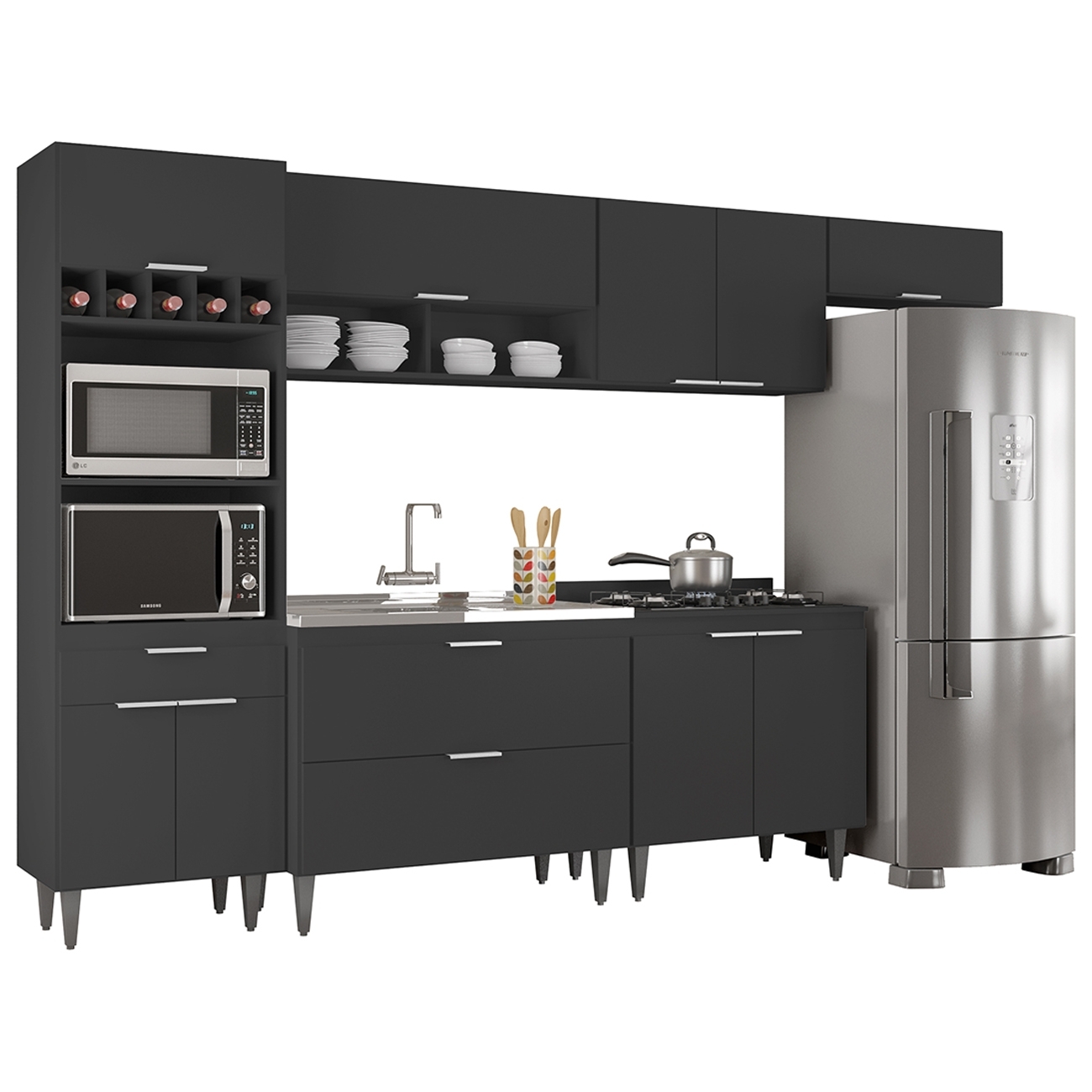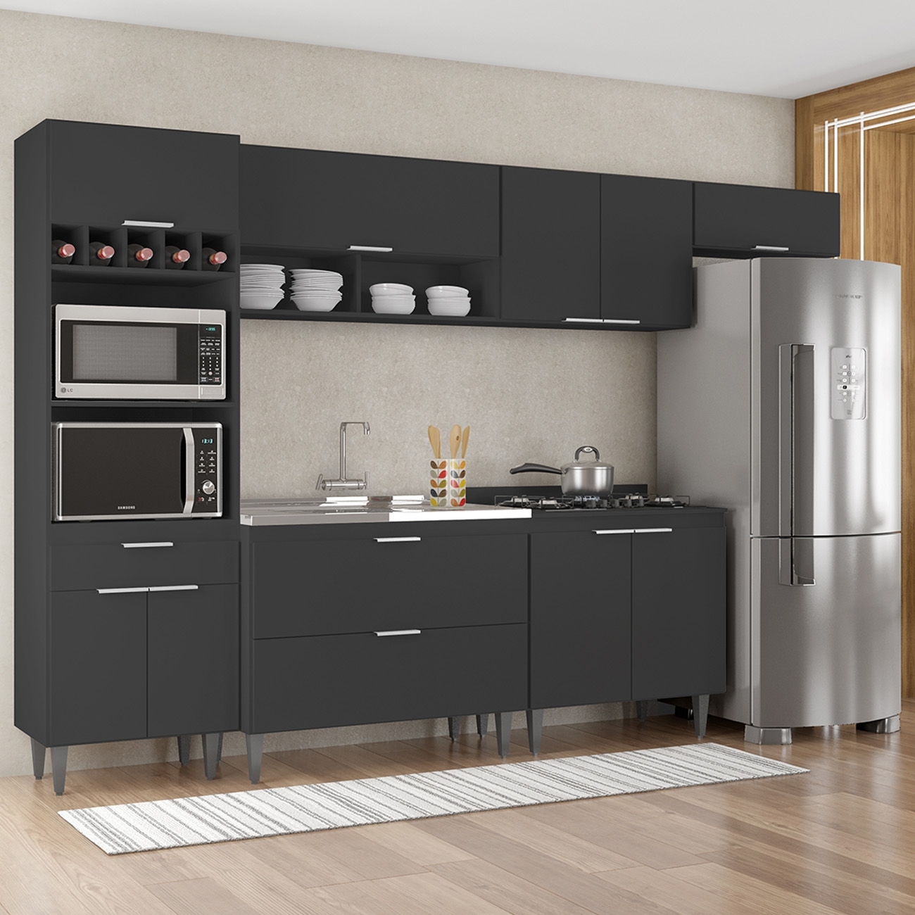 O Paneleiro conta com dois compartimentos para acomodar micro-ondas e forno elétrico, e cinco nichos na parte superior. Ele também inclui três portas, sendo uma delas basculante, além de uma gaveta para melhor organização dos seus utensílios. O Armário Aéreo 100cm possui uma porta basculante com pistão a gás e dois nichos, que se destacam com elegância. O é um ótimo complemento, agregando praticidade e estilo. Já o Armário Aéreo 80cm dispõe de duas portas convencionais, com uma prateleira interna. O Balcão Gabinete vem com duas portas basculantes com fecho trava de segurança, que permite o fechamento com um simples toque. Enquanto o Balcão 80cm com Tampo conta com duas portas convencionais, com uma prateleira interna, oferecendo amplo espaço de armazenamento. Todos os móveis possuem estrutura em MDP 15mm, com acabamento em BP, puxadores em alumínio, dobradiças e corrediças metálicas, que garantem máxima resistência no uso diário. A Pia Inox apresenta um design ideal, que tem excelente desempenho no escoamento da água e possibilita o uso de diferentes objetos sobre ela. Os pés em PVC, são reguláveis, permitindo ajustar pequenos desníveis de piso. Este Armário de Cozinha é a solução perfeita para otimizar sua casa, combinando sofisticação e materiais de alta qualidade.