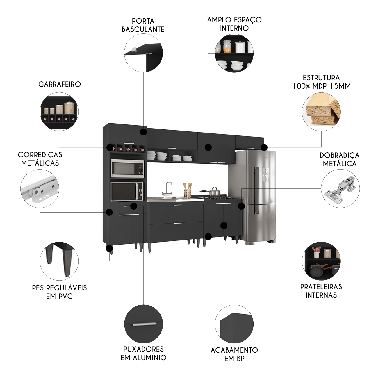 Características do Produto Material da Estrutura: MDP 15mm. Material do fundo: HDF 3mm. Peso Suportado: 180 Kg distribuídos. Acompanha Pia: Sim. Acompanha Tampo: Não. Acabamento: Melamina BP. Escala de brilho: Fosco. Possui Portas: Sim. Quantidade de Portas: 11 Portas. Tipo de Porta: Convencional/Basculante. Tipo de Dobradiças: Metálicas. Possui Gavetas: Sim. Quantidade de Gavetas: 1 Gaveta. Tipo de Corrediças: Metálicas. Possui Puxador: Sim. Material do Puxador: Alumínio. Possui Prateleiras: Sim. Quantidade de Prateleiras: 2 Prateleiras. Possui Nichos: Sim. Quantidade de Nichos: 9 Nichos. Possui Pés: Sim. Quantidade de Pés: 12 Pés. Material dos Pés: PVC. Altura dos Pés: 17cm com regulagem. Diferenciais: