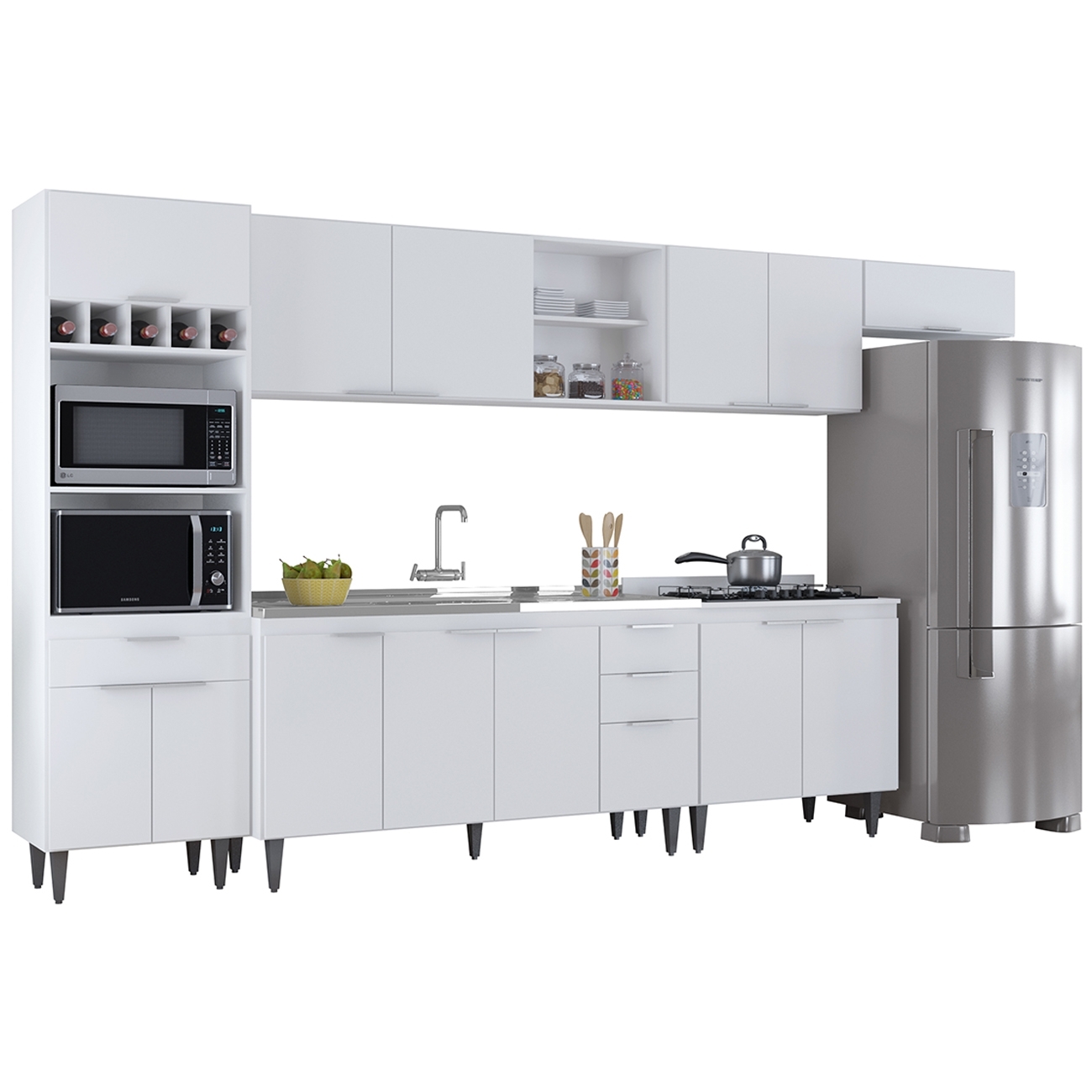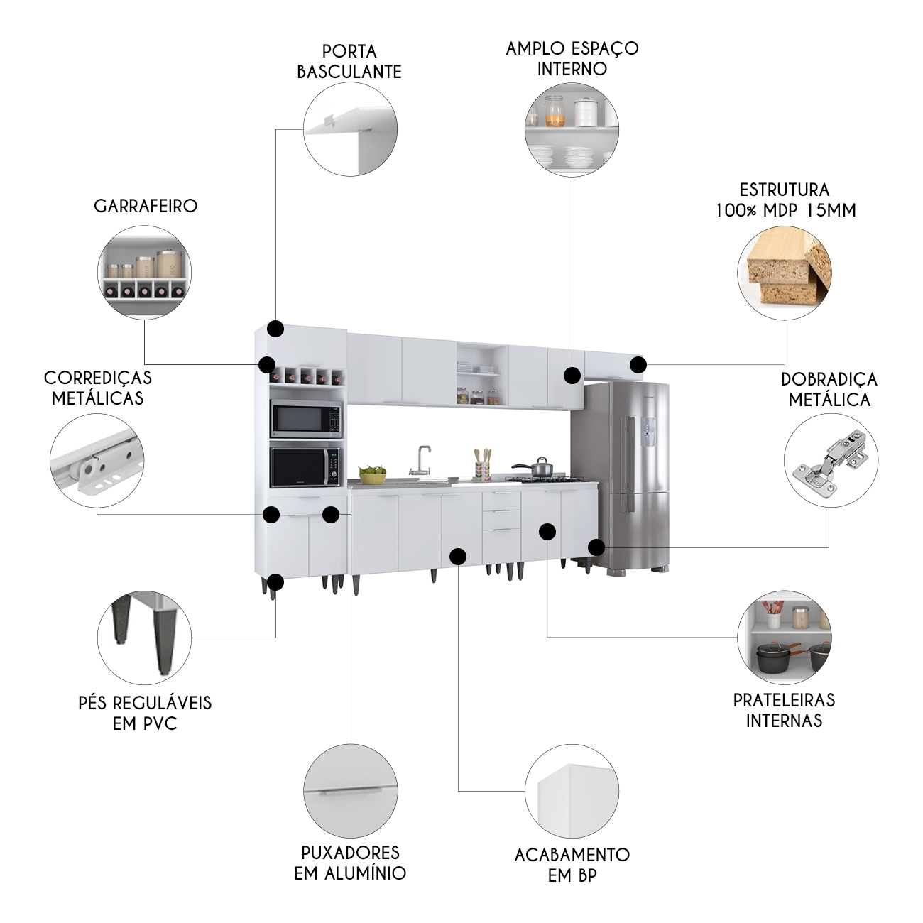 O Paneleiro conta com dois compartimentos para acomodar micro-ondas e forno elétrico, e cinco nichos na parte superior. Ele também inclui três portas, sendo uma delas basculante, além de uma gaveta para melhor organização dos seus utensílios. Os Armários Aéreos dispõe de quatro portas convencionais, uma basculante, dois nichos laterais e duas prateleiras internas, agregando praticidade e estilo. Já o Balcão Gabinete e o Balcão 80cm com Tampo possuem seis portas e duas gavetas, com duas prateleiras internas que oferecem amplo espaço de armazenamento. Todos os móveis possuem estrutura em MDP 15mm, com acabamento em BP, puxadores em alumínio, dobradiças e corrediças metálicas, que garantem máxima resistência no uso diário. A Pia Inox apresenta um design ideal, que tem excelente desempenho no escoamento da água e possibilita o uso de diferentes objetos sobre ela. Os pés em PVC, são reguláveis, permitindo ajustar pequenos desníveis de piso. Este Armário de Cozinha é a solução perfeita para otimizar sua casa, combinando elegância e materiais de alta qualidade.