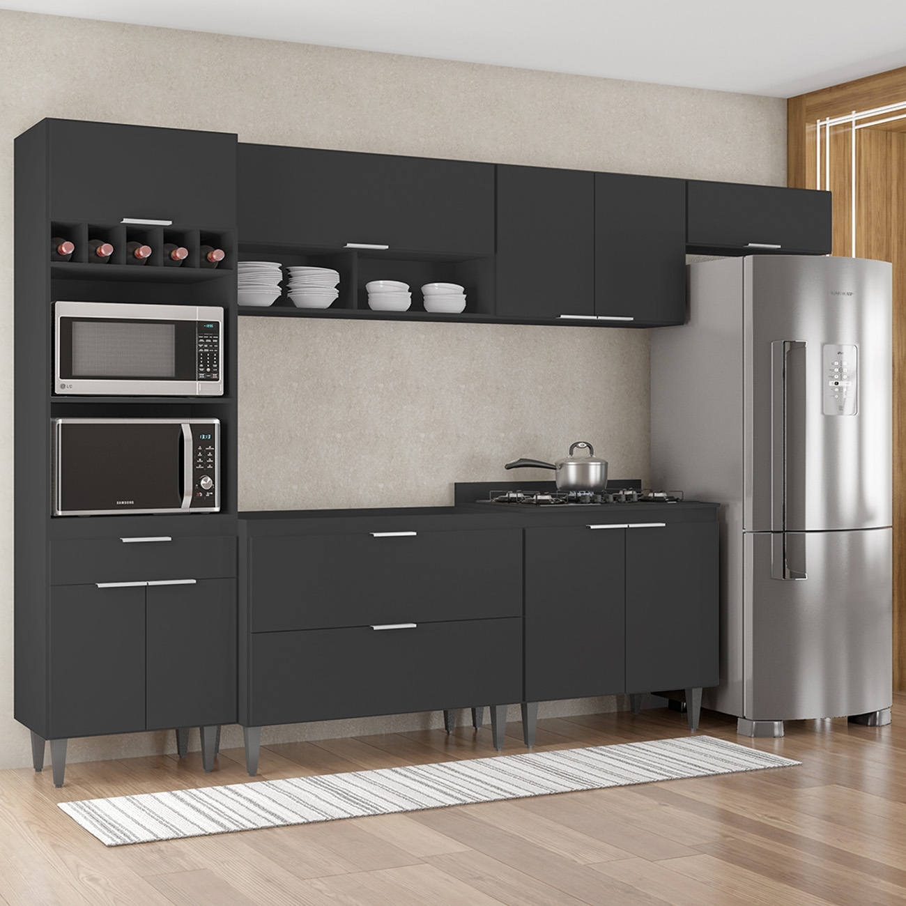 O Paneleiro conta com dois compartimentos para acomodar micro-ondas e forno elétrico, e cinco nichos na parte superior. Ele também inclui três portas, sendo uma delas basculante, além de uma gaveta para melhor organização dos seus utensílios. O Armário Aéreo 100cm possui uma porta basculante com pistão a gás e dois nichos, que se destacam com elegância. O é um ótimo complemento, agregando praticidade e estilo. Já o Armário Aéreo 80cm dispõe de duas portas convencionais, com uma prateleira interna. O Balcão Para Pia vem com duas portas basculantes com fecho trava de segurança, que permite o fechamento com um simples toque. Enquanto o Balcão 80cm com Tampo conta com duas portas convencionais, com uma prateleira interna, oferecendo amplo espaço de armazenamento. Todos os móveis possuem estrutura em MDP 15mm, com acabamento em BP, puxadores em alumínio, dobradiças e corrediças metálicas, que garantem máxima resistência no uso diário. Os pés em PVC, são reguláveis, permitindo ajustar pequenos desníveis de piso. O balcão gabinete não acompanha tampo para que o uso fique opcional com tampo ou pia. Este Armário de Cozinha é a solução ideal para otimizar sua casa, combinando materiais de alta qualidade com um design sofisticado.