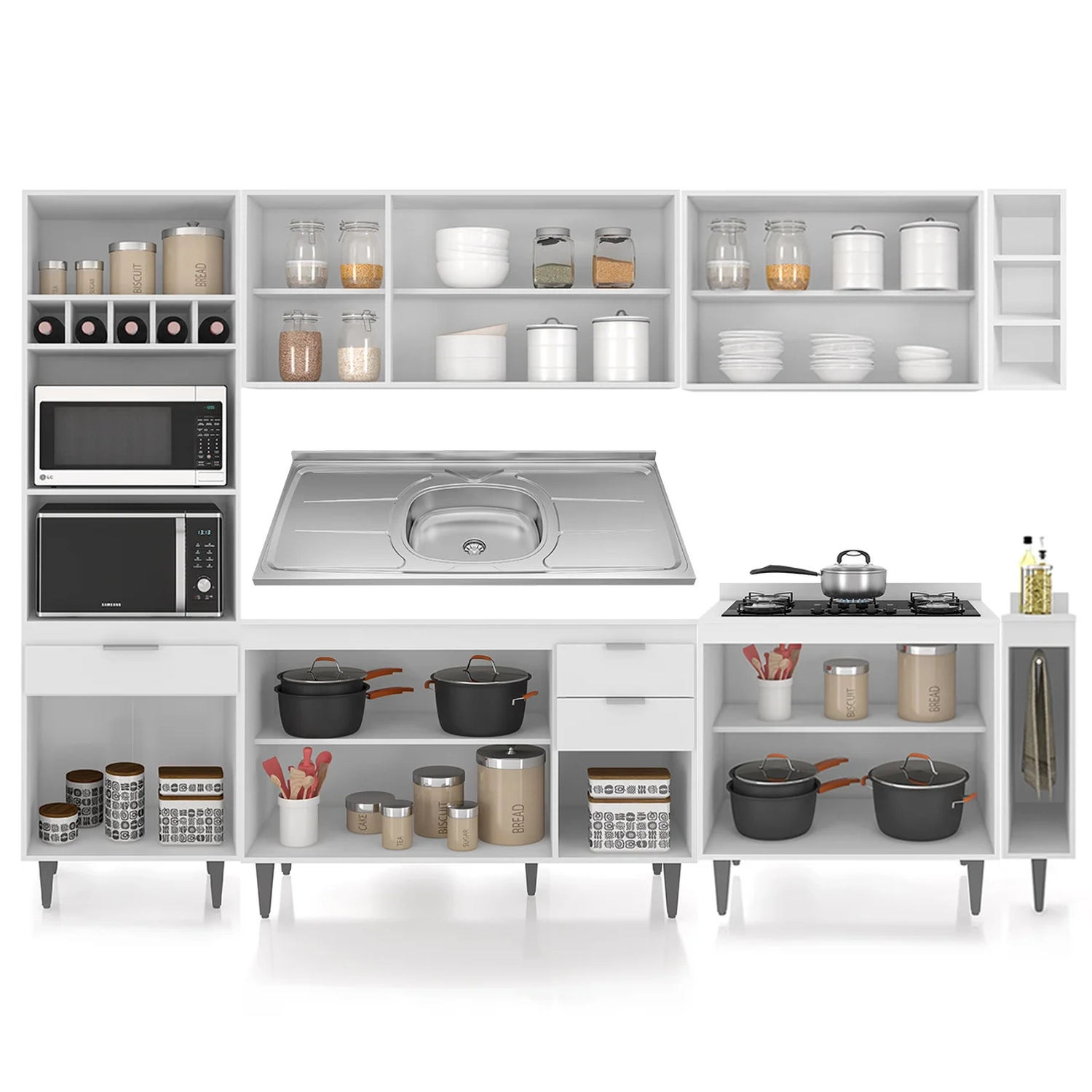 O Paneleiro conta com dois compartimentos para acomodar micro-ondas e forno elétrico, e cinco nichos na parte superior. Ele também inclui três portas, sendo uma delas basculante, além de uma gaveta para melhor organização dos seus utensílios. Os Armários Aéreos dispõe de cinco portas e duas prateleiras internas, oferecendo praticidade e estilo. O Balcão Gabinete e o Balcão 80cm com Tampo possuem cinco portas e duas gavetas, com duas prateleiras internas que proporcionam amplo espaço de armazenamento. Já o Balcão Porta Pano traz um suporte de aço para guardanapos e o nicho adega que conta com três repartições. Todos os móveis possuem estrutura em MDP 15mm, com acabamento em BP, puxadores em alumínio, dobradiças e corrediças metálicas, que garantem máxima resistência no uso diário. A Pia Inox apresenta um design ideal, que tem excelente desempenho no escoamento da água e possibilita o uso de diferentes objetos sobre ela. Os pés em PVC, são reguláveis, permitindo ajustar pequenos desníveis de piso. Este Armário de Cozinha é a solução perfeita para otimizar sua casa, combinando elegância e materiais de alta qualidade.