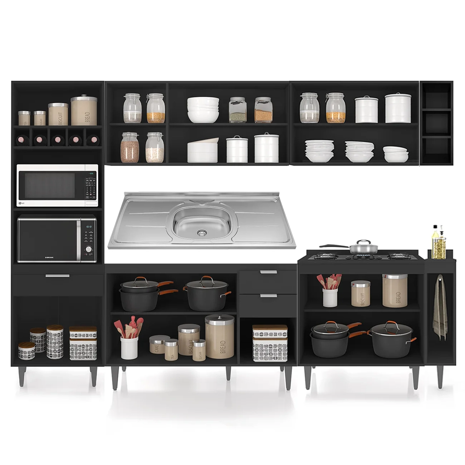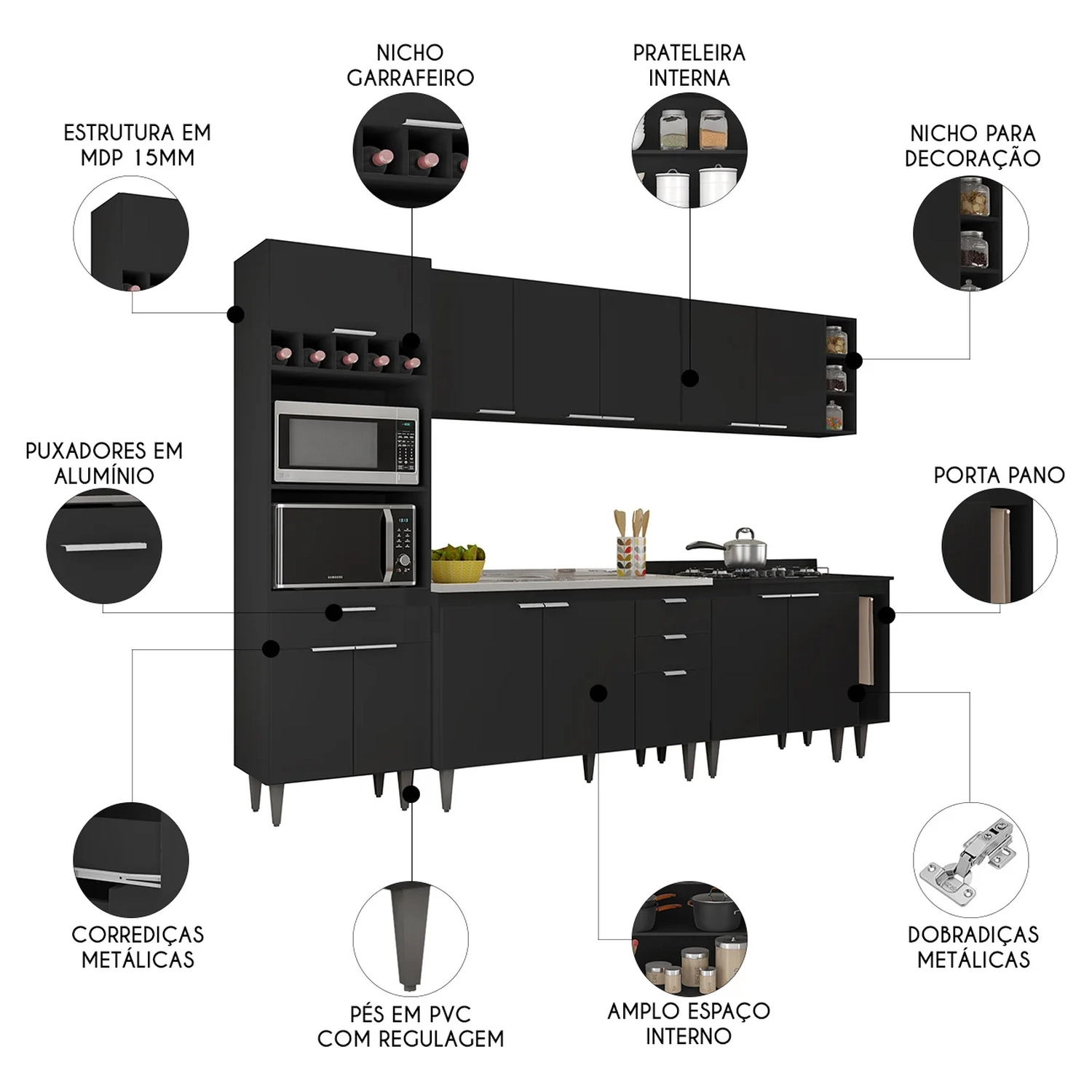 O Paneleiro conta com dois compartimentos para acomodar micro-ondas e forno elétrico, e cinco nichos na parte superior. Ele também inclui três portas, sendo uma delas basculante, além de uma gaveta para melhor organização dos seus utensílios. Os Armários Aéreos dispõe de cinco portas e duas prateleiras internas, oferecendo praticidade e estilo. O Balcão Gabinete e o Balcão 80cm com Tampo possuem cinco portas e duas gavetas, com duas prateleiras internas que proporcionam amplo espaço de armazenamento. Já o Balcão Porta Pano traz um suporte de aço para guardanapos e o nicho adega que conta com três repartições. Todos os móveis possuem estrutura em MDP 15mm, com acabamento em BP, puxadores em alumínio, dobradiças e corrediças metálicas, que garantem máxima resistência no uso diário. A Pia Inox apresenta um design ideal, que tem excelente desempenho no escoamento da água e possibilita o uso de diferentes objetos sobre ela. Os pés em PVC, são reguláveis, permitindo ajustar pequenos desníveis de piso. Este Armário de Cozinha é a solução perfeita para otimizar sua casa, combinando elegância e materiais de alta qualidade.