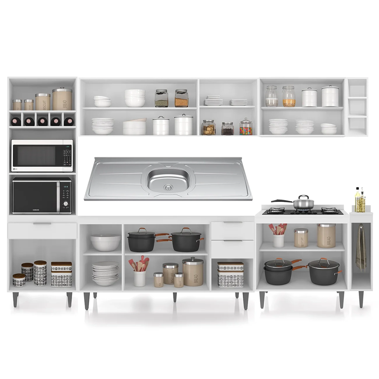 Conteúdo da Embalagem: 1 Armário Aéreo 150cm, 1 Armário Aéreo 80cm, 1 Balcão 148cm, 1 Balcão 80cm, 1 Balcão Porta Pano, 1 Paneleiro, 1 Nicho Adega, 1 Pia.