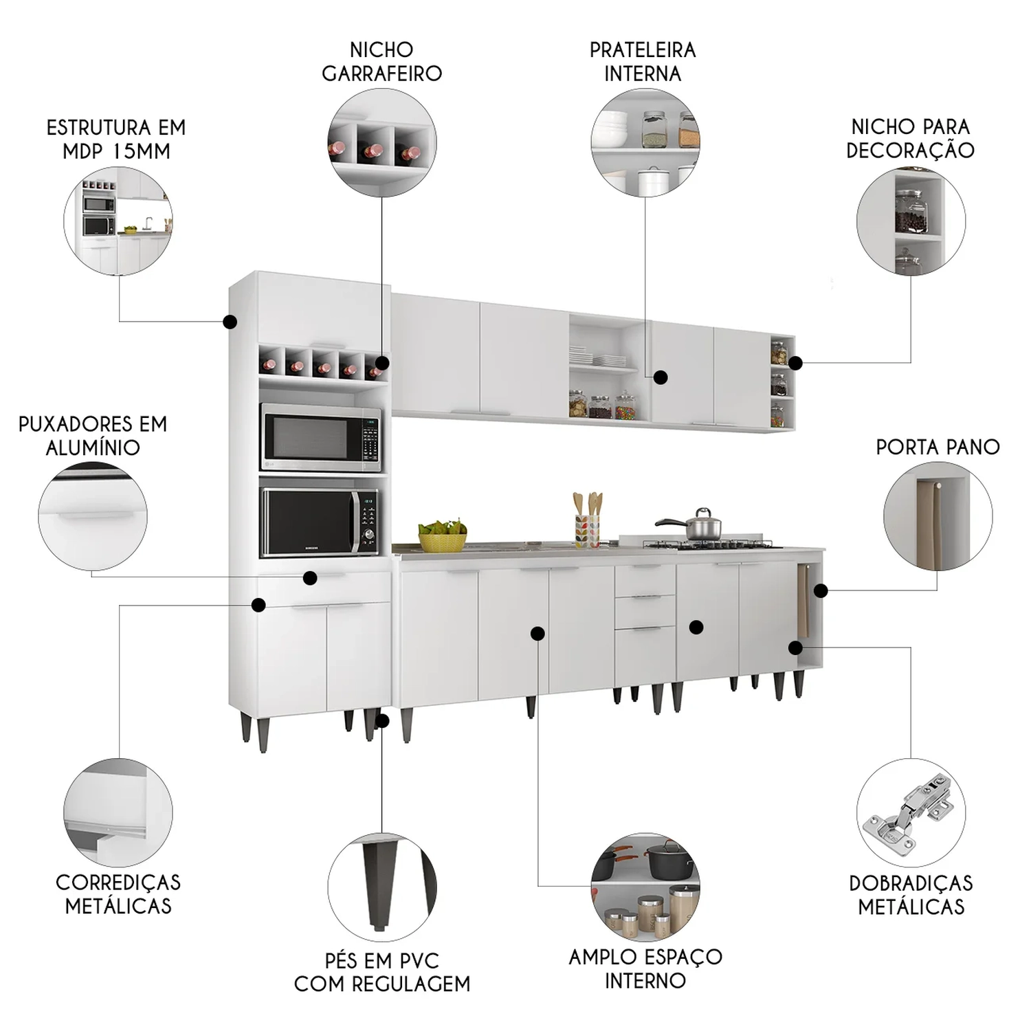 O Paneleiro conta com dois compartimentos para acomodar micro-ondas e forno elétrico, e cinco nichos na parte superior. Ele também inclui três portas, sendo uma delas basculante, além de uma gaveta para melhor organização dos seus utensílios. Os Armários Aéreos dispõe de quatro portas, dois nichos laterais e duas prateleiras internas, agregando praticidade e estilo. O Balcão Gabinete e o Balcão 80cm com Tampo possuem seis portas e duas gavetas, com duas prateleiras internas que oferecem amplo espaço de armazenamento. Já o Balcão Porta Pano traz um suporte de aço para guardanapos e o nicho adega que conta com três repartições. Todos os móveis possuem estrutura em MDP 15mm, com acabamento em BP, puxadores em alumínio, dobradiças e corrediças metálicas, que garantem máxima resistência no uso diário. A Pia Inox apresenta um design ideal, que tem excelente desempenho no escoamento da água e possibilita o uso de diferentes objetos sobre ela. Os pés em PVC, são reguláveis, permitindo ajustar pequenos desníveis de piso. Este Armário de Cozinha é a solução perfeita para otimizar sua casa, combinando elegância e materiais de alta qualidade.