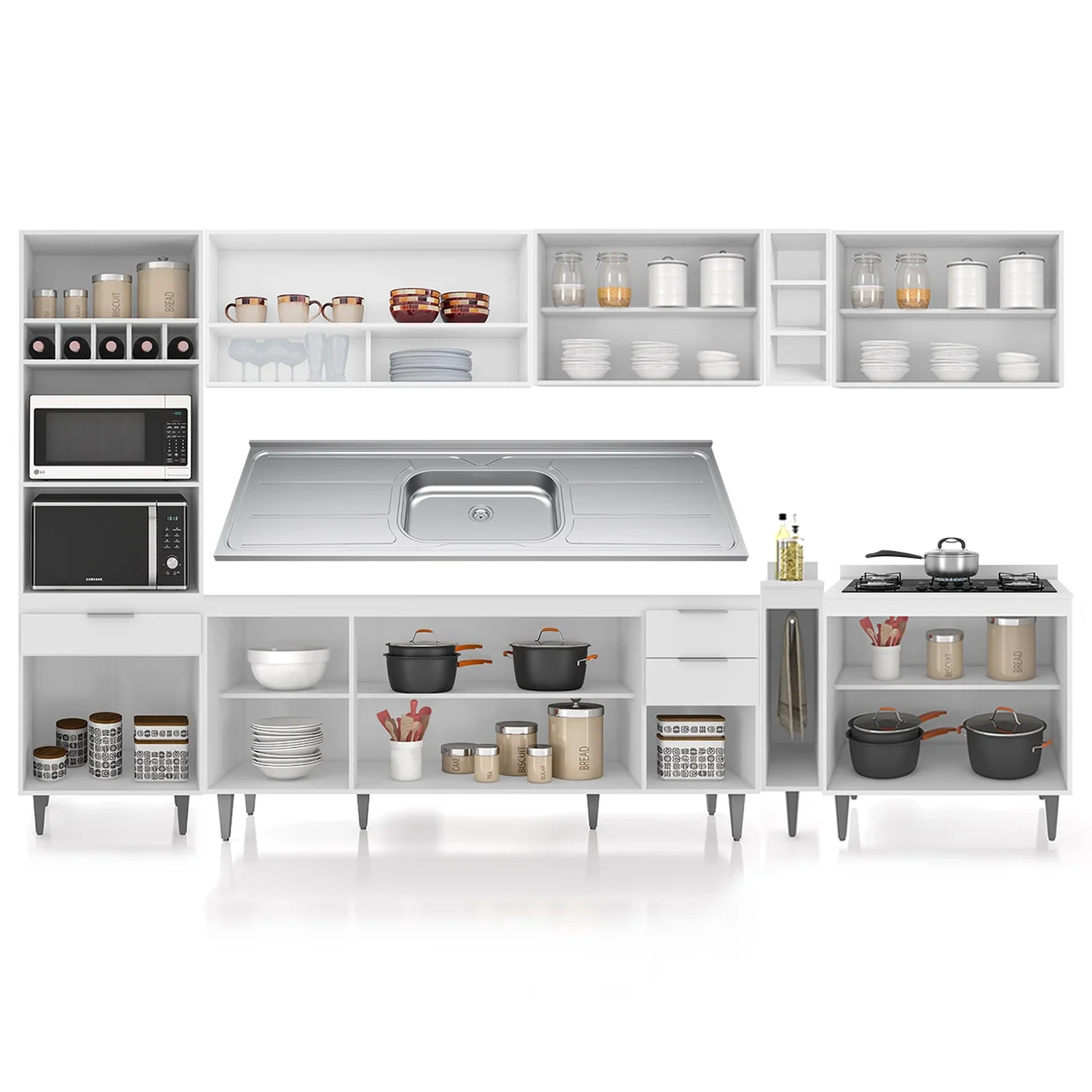 O Paneleiro conta com dois compartimentos para acomodar micro-ondas e forno elétrico, e cinco nichos na parte superior. Ele também inclui três portas, sendo uma delas basculante, além de uma gaveta para melhor organização dos seus utensílios. Os Armários Aéreos dispõe de quatro portas convencionais, uma porta basculante com pistão a gás, dois nichos e duas prateleiras internas, agregando praticidade e estilo. O Balcão gabinete e o Balcão 80cm com Tampo possuem seis portas e duas gavetas, com duas prateleiras internas que oferecem amplo espaço de armazenamento. Já o Balcão Porta Pano traz um suporte de aço para guardanapos e o nicho adega que conta com três repartições. Todos os móveis possuem estrutura em MDP 15mm, com acabamento em BP, puxadores em alumínio, dobradiças e corrediças metálicas, que garantem máxima resistência no uso diário. A Pia Inox apresenta um design ideal, que tem excelente desempenho no escoamento da água e possibilita o uso de diferentes objetos sobre ela. Os pés em PVC, são reguláveis, permitindo ajustar pequenos desníveis de piso. Este Armário de Cozinha é a solução perfeita para otimizar sua casa, combinando elegância e materiais de alta qualidade.