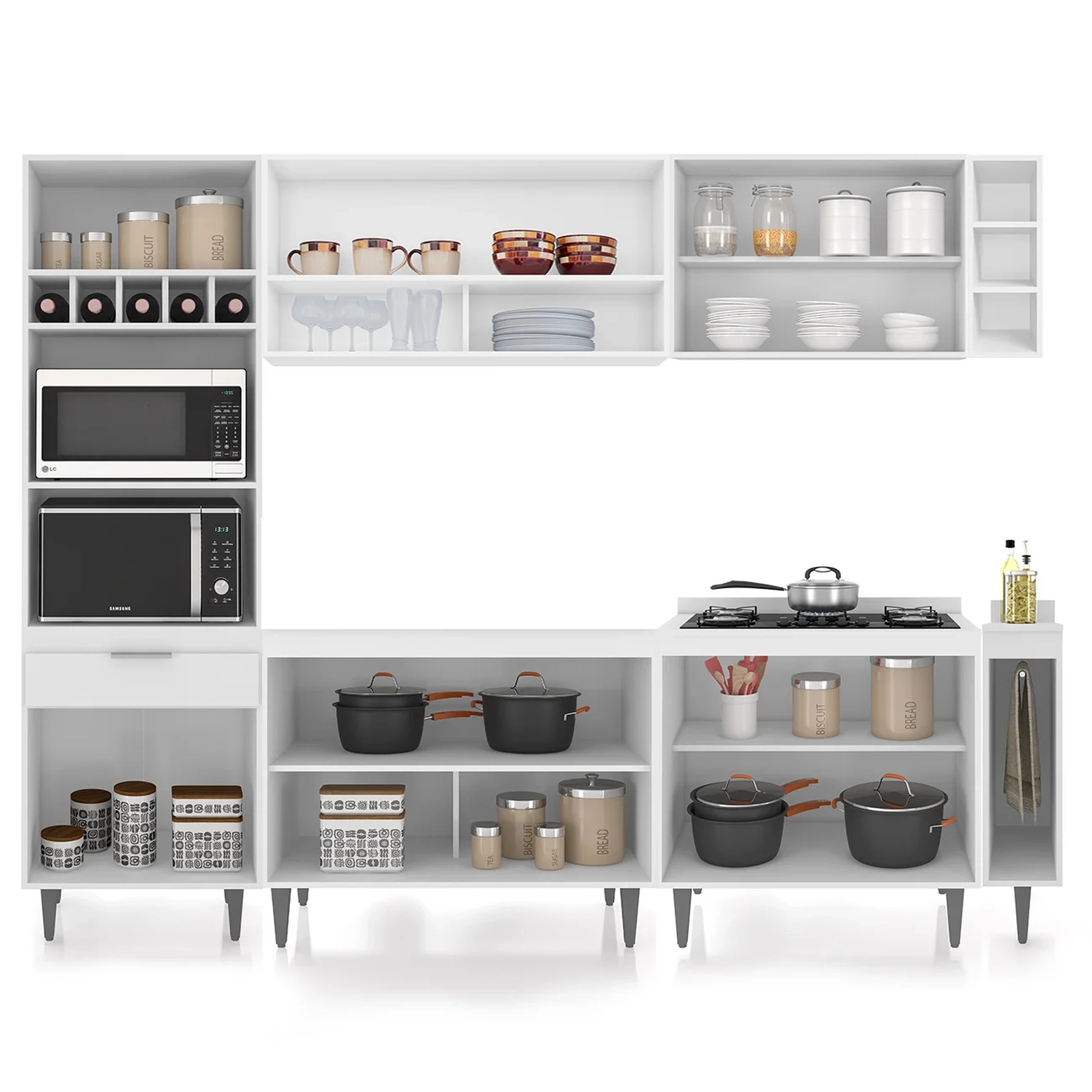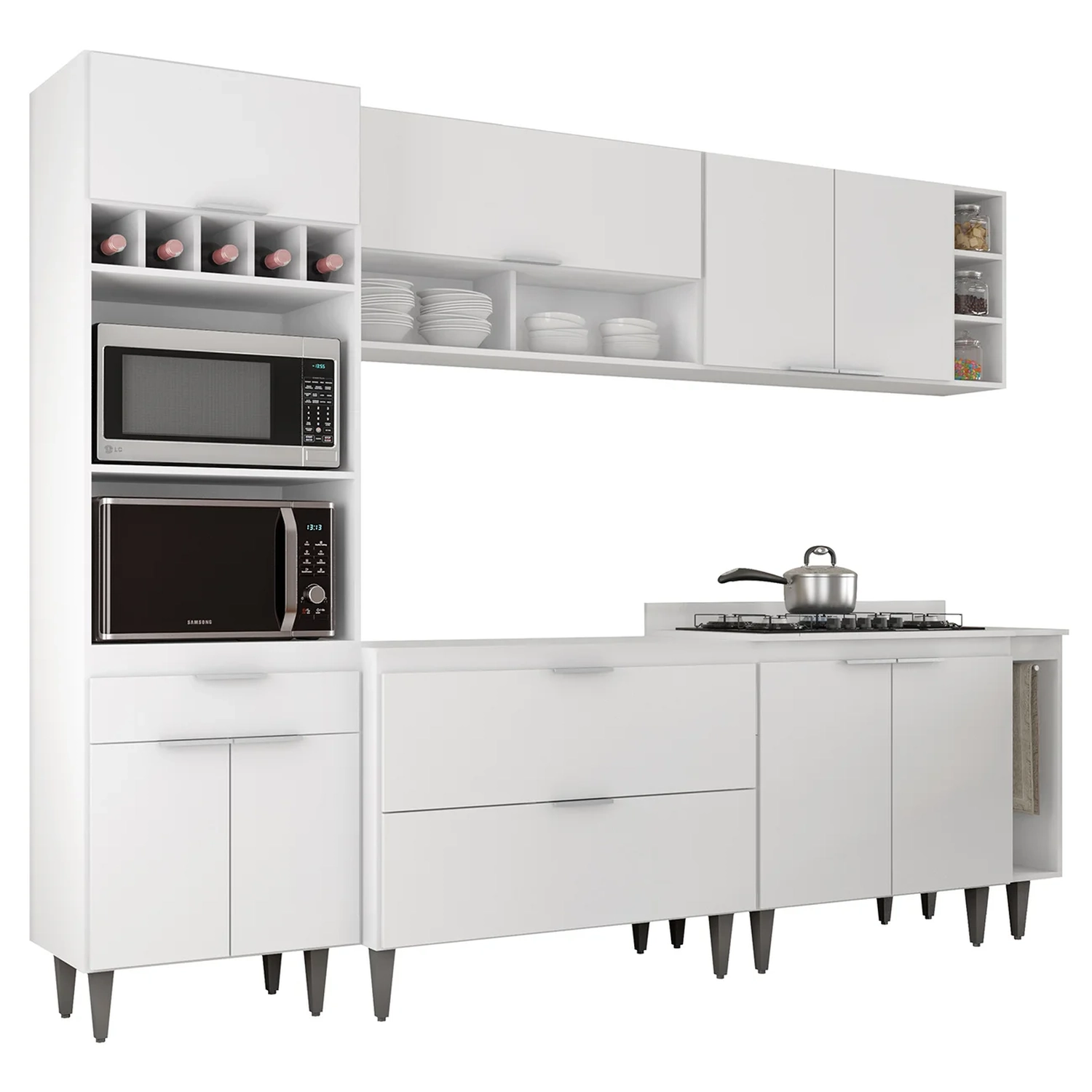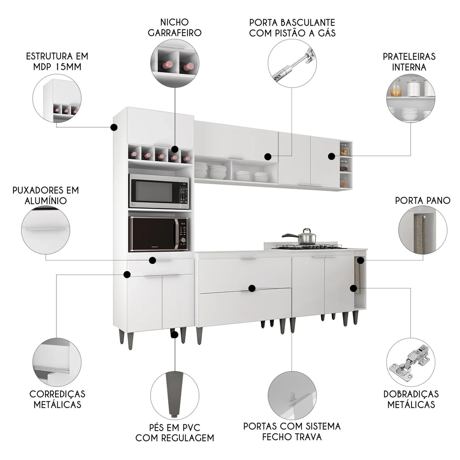 O Paneleiro conta com dois compartimentos para acomodar micro-ondas e forno elétrico, e cinco nichos na parte superior. Ele também inclui três portas, sendo uma delas basculante, além de uma gaveta para melhor organização dos seus utensílios. O Armário Aéreo 100cm possui uma porta basculante com pistão a gás e dois nichos, que se destacam com elegância. Já Armário Aéreo 80cm dispõe de duas portas convencionais, com uma prateleira interna. O Balcão Para Pia vem com duas portas basculantes com fecho trava de segurança, que permite o fechamento com um simples toque. Enquanto o Balcão 80cm com Tampo possui duas portas convencionais, com uma prateleira interna, oferecendo amplo espaço de armazenamento. Já o Balcão Porta Pano traz um suporte de aço para guardanapos e o nicho adega que conta com três repartições. Todos os móveis possuem estrutura em MDP 15mm, com acabamento em BP, puxadores em alumínio, dobradiças e corrediças metálicas, que garantem máxima resistência no uso diário. Os pés em PVC, são reguláveis, permitindo ajustar pequenos desníveis de piso. O balcão gabinete não acompanha tampo para que o uso fique opcional com tampo ou pia. Este Armário de Cozinha é a solução ideal para otimizar sua casa, combinando materiais de alta qualidade com um design sofisticado.