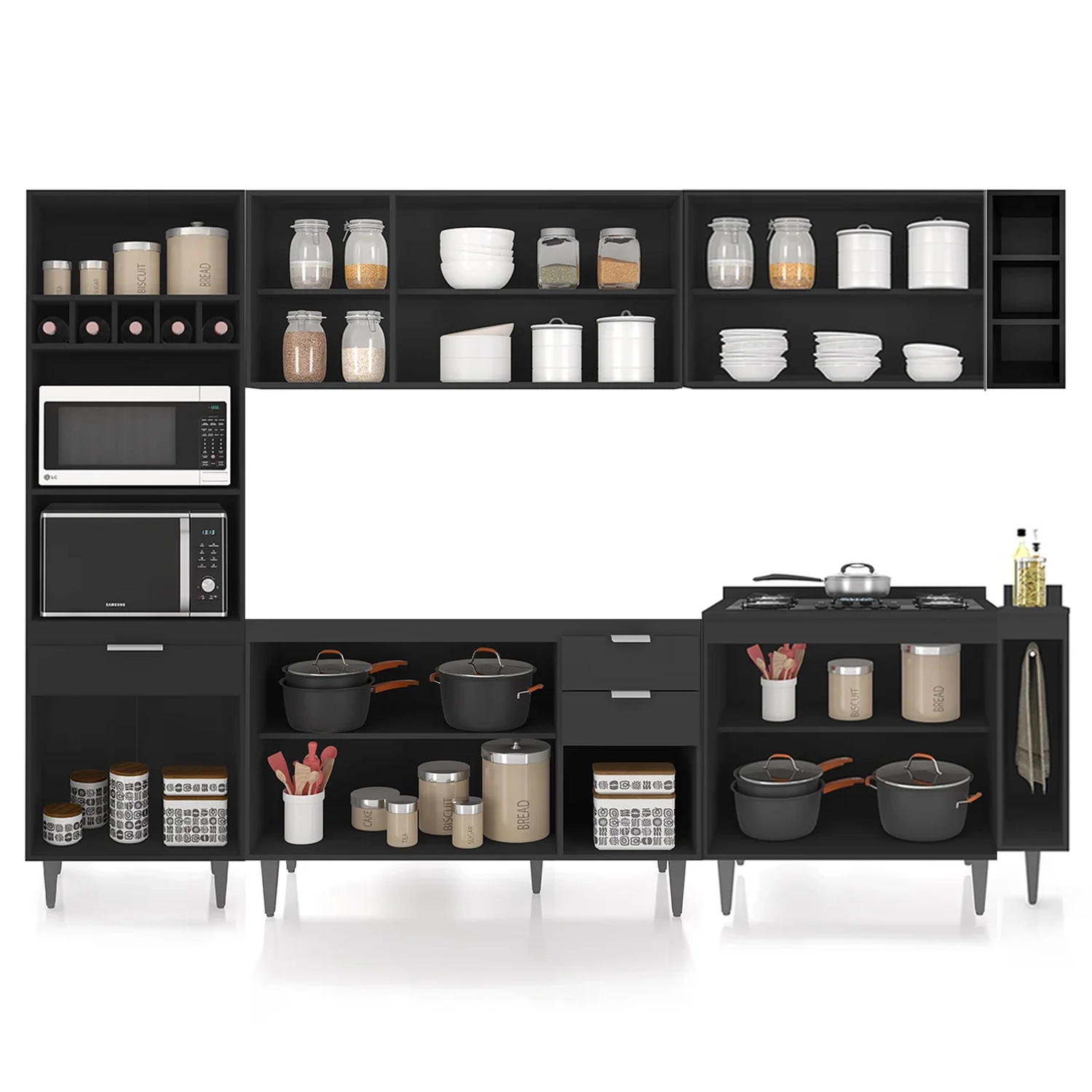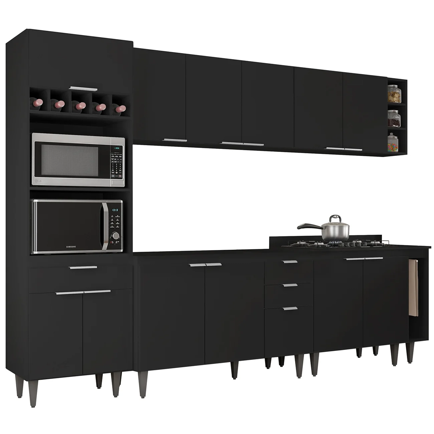 O Paneleiro conta com dois compartimentos para acomodar micro-ondas e forno elétrico, e cinco nichos na parte superior. Ele também inclui três portas, sendo uma delas basculante, além de uma gaveta para melhor organização dos seus utensílios. Os Armários Aéreos dispõe de cinco portas e duas prateleiras internas, oferecendo praticidade e estilo. O Balcão Para Pia e o Balcão 80cm com Tampo possuem cinco portas e duas gavetas, com duas prateleiras internas que proporcionam amplo espaço de armazenamento. Já o Balcão Porta Pano traz um suporte de aço para guardanapos e o nicho adega que conta com três repartições. Todos os móveis possuem estrutura em MDP 15mm, com acabamento em BP, puxadores em alumínio, dobradiças e corrediças metálicas, que garantem máxima resistência no uso diário. Os pés em PVC, são reguláveis, permitindo ajustar pequenos desníveis de piso. O balcão gabinete não acompanha tampo para que o uso fique opcional com tampo ou pia. Este Armário de Cozinha é a solução ideal para otimizar sua casa, combinando materiais de alta qualidade com um design sofisticado.
