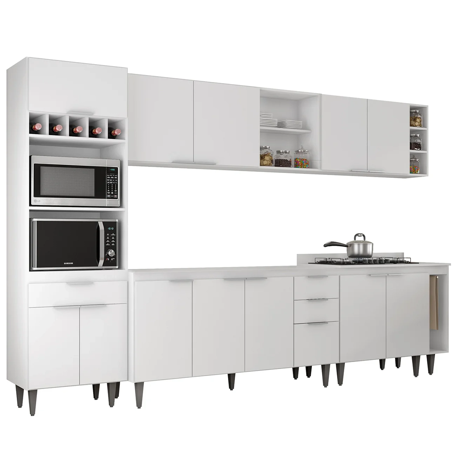 O Paneleiro conta com dois compartimentos para acomodar micro-ondas e forno elétrico, e cinco nichos na parte superior. Ele também inclui três portas, sendo uma delas basculante, além de uma gaveta para melhor organização dos seus utensílios. Os Armários Aéreos dispõe de quatro portas, dois nichos laterais e duas prateleiras internas, agregando praticidade e estilo. O Balcão Para Pia e o Balcão 80cm com Tampo possuem seis portas e duas gavetas, com duas prateleiras internas que oferecem amplo espaço de armazenamento. Já o Balcão Porta Pano traz um suporte de aço para guardanapos e o nicho adega que conta com três repartições. Todos os móveis possuem estrutura em MDP 15mm, com acabamento em BP, puxadores em alumínio, dobradiças e corrediças metálicas, que garantem máxima resistência no uso diário. Os pés em PVC, são reguláveis, permitindo ajustar pequenos desníveis de piso. O balcão gabinete não acompanha tampo para que o uso fique opcional com tampo ou pia. Este Armário de Cozinha é a solução ideal para otimizar sua casa, combinando materiais de alta qualidade com um design sofisticado.